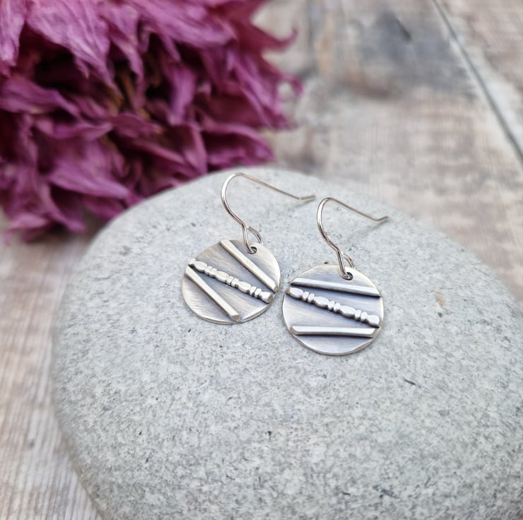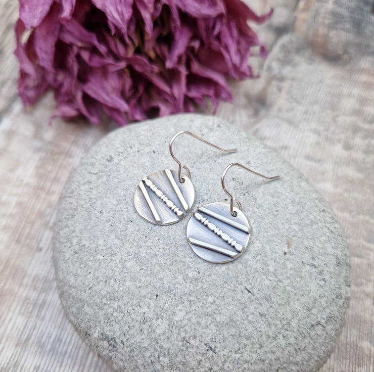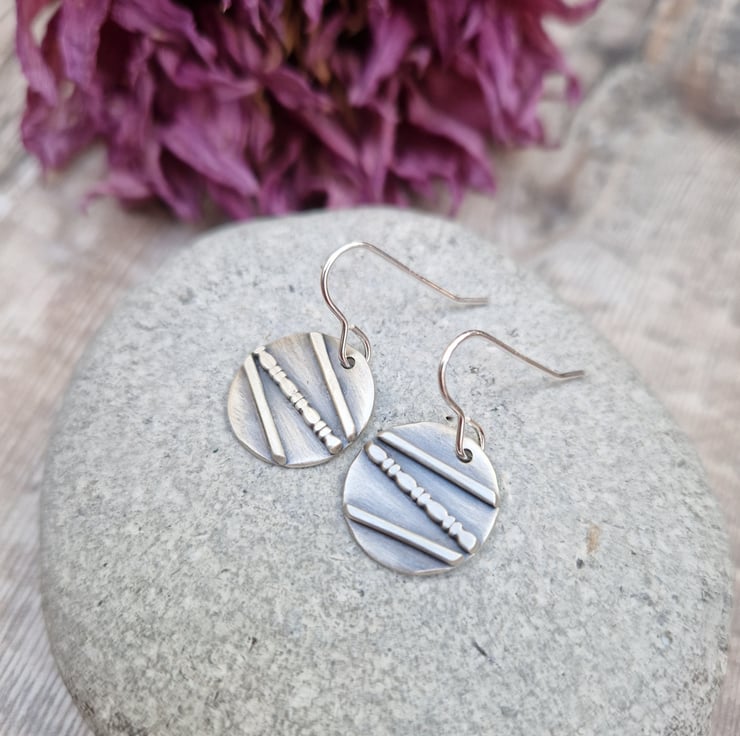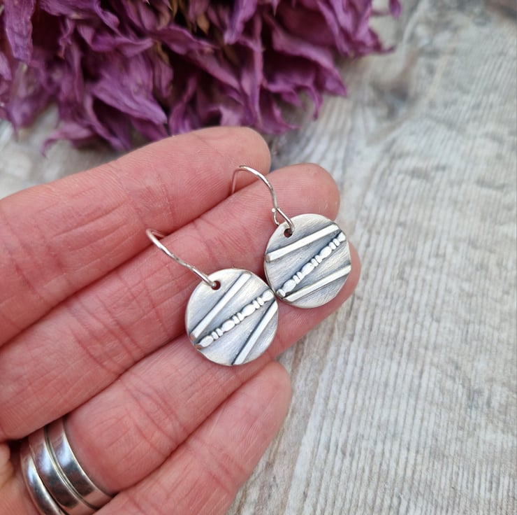 A pair of one-of-a-kind oxidised silver disc earrings, handmade from recycled sterling silver. Each earring features a unique line and dot pattern, carefully created by hand and finished with an oxidised effect to bring out the detail. The result is a beautifully textured surface with a mix of matte and darkened silver tones.