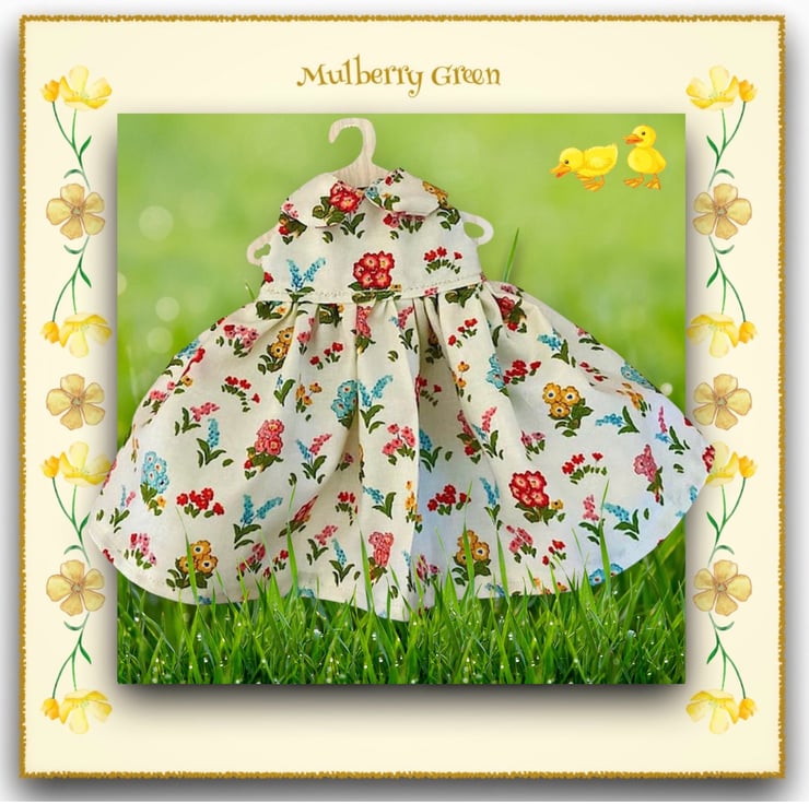 A beautiful little dress in a Liberty print - Kensington Gardens, to fit the Mulberry Green characters. The dress is made from best quality designer cotton, has a full skirt and a lined bodice.