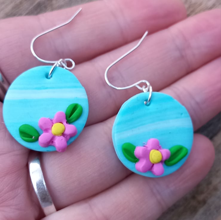 Spring has sprung with these cute little earrings, they are made in soft blue shades of polymer clay with pink flower details on both.
