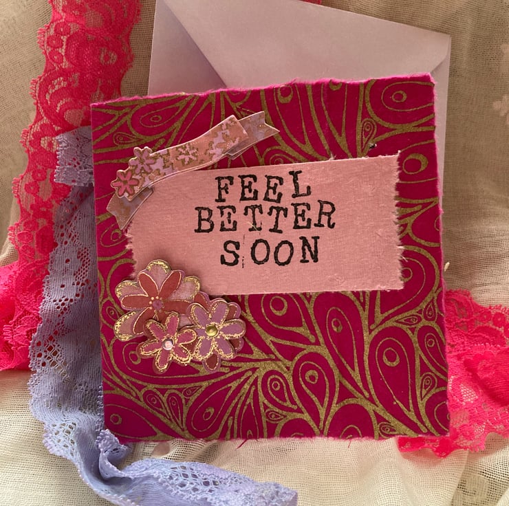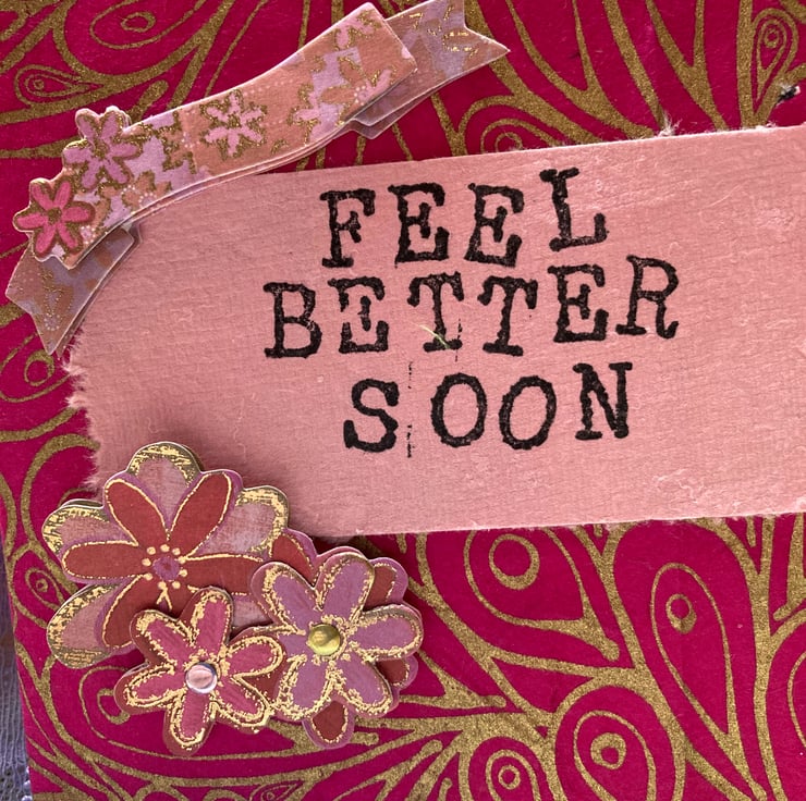 In the middle the words FEEL BETTER SOON are stamped in black ink on a paler pink paper.