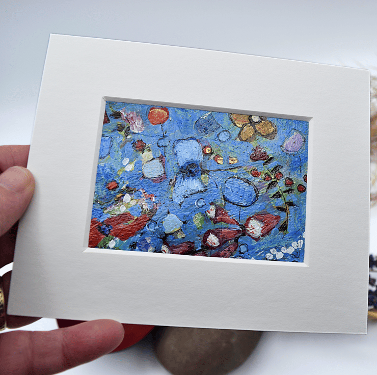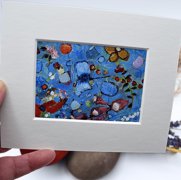 This is an original, one-off painting at 3.5 x 2.5 inches. The total size including the mount is, 5.5 x 4.5 inches (14 x 11.4 cms). Please note, this work comes unframed. It is mounted and is ready for a frame of your choosing or can be saved in a collector's album.