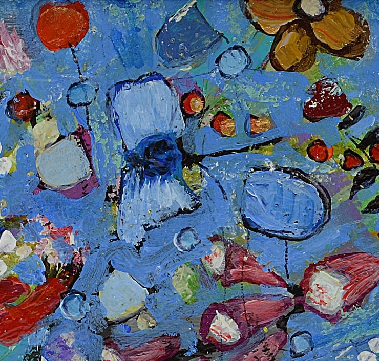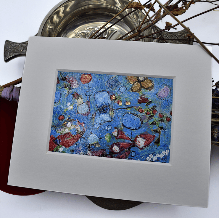 This is an small abstract, original painting of wildflowers. I have used very small knives and old nails to apply the painting across the paper.