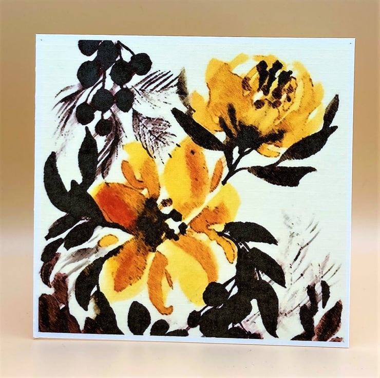 I love cards and keep favorite ones sent to me over the years. This card is an unusual colour combination with vibrant golden yellow flowers contrasting with the somber overtones of purple, brown and black leaves and berries. I think it could be used as one of those 'difficult to find cards' for awkward or sad situations. A handcrafted card can say so much and you can never go wrong with flowers as a subject. I really enjoy painting flowers and playing around with subsequent prints, which I then use to make unusual and original cards. I like to think that someone might also keep one of my cards as a reminder of a significant day and they look great framed.
