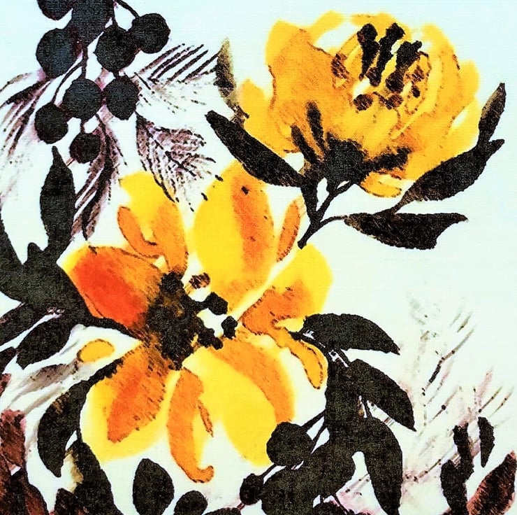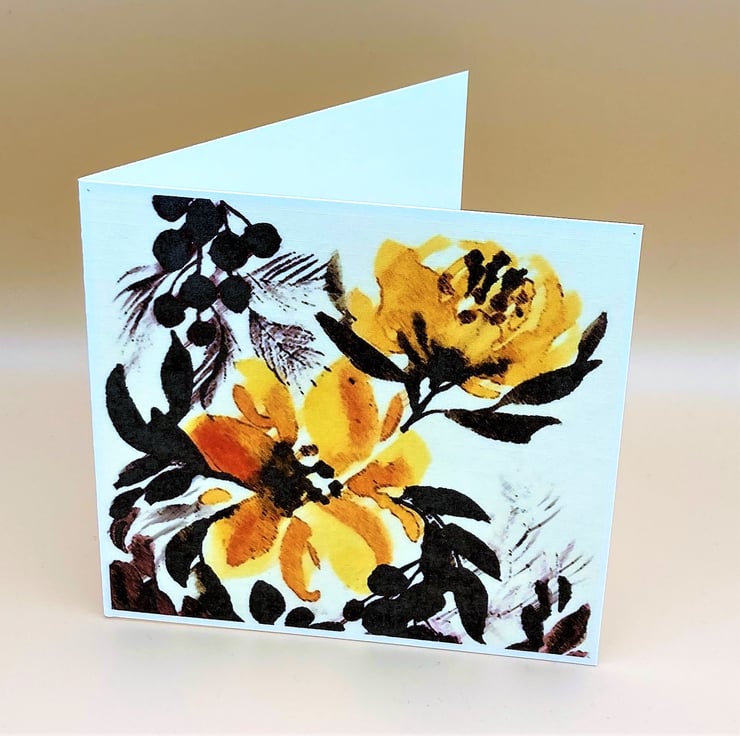Taken from one of my original watercolour paintings this little card is a colourful way to send your own message on any occasion. The card shows yellow peony rose flowers against dark purple black leaves and berries. The colours create a dramatic contrast and the card image is manipulated to give a slight 'film grain' finish which lends air of vintage glamour to the print.
