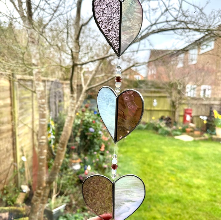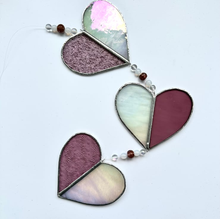 This suncatcher is made from a string of 3 pink and white stained glass hearts strung together with beaded fishing line.
