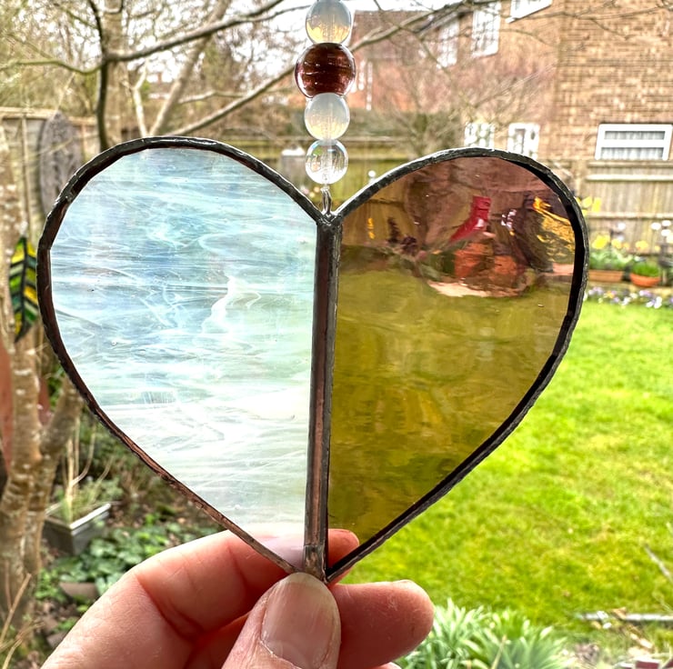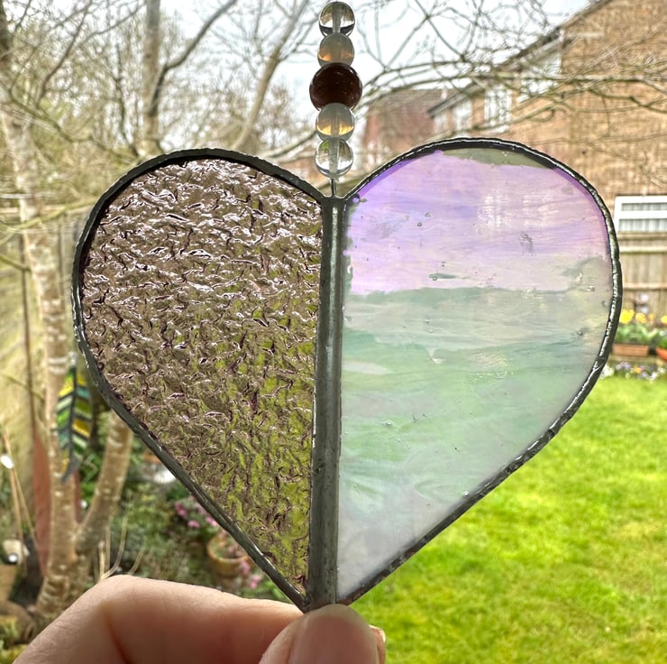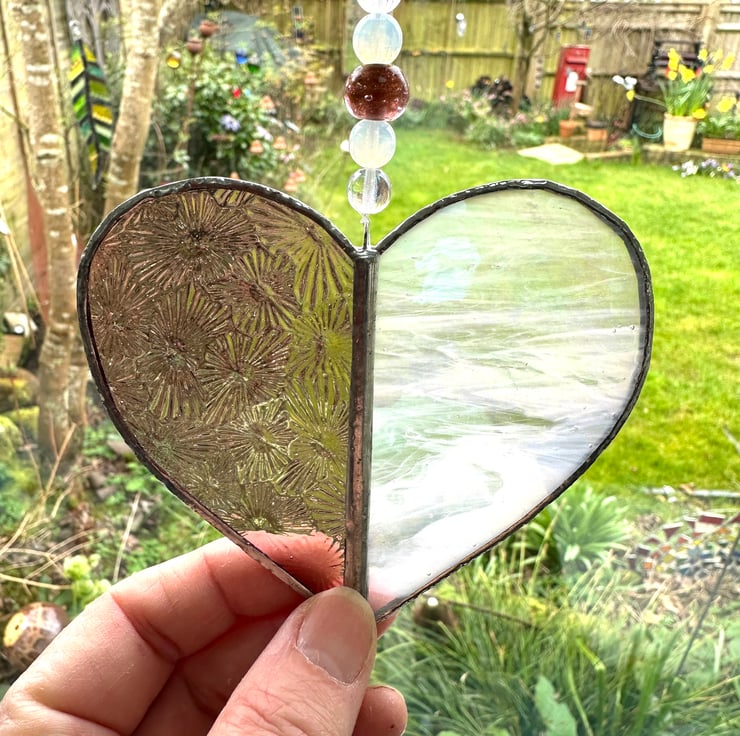 The hearts have been made fusing three types of pink glass, an old reclaimed textured pink glass, pink water glass and pink florentine glass and iridesided white streaky sea glass.
