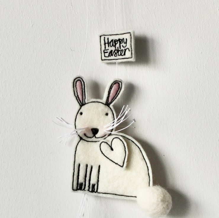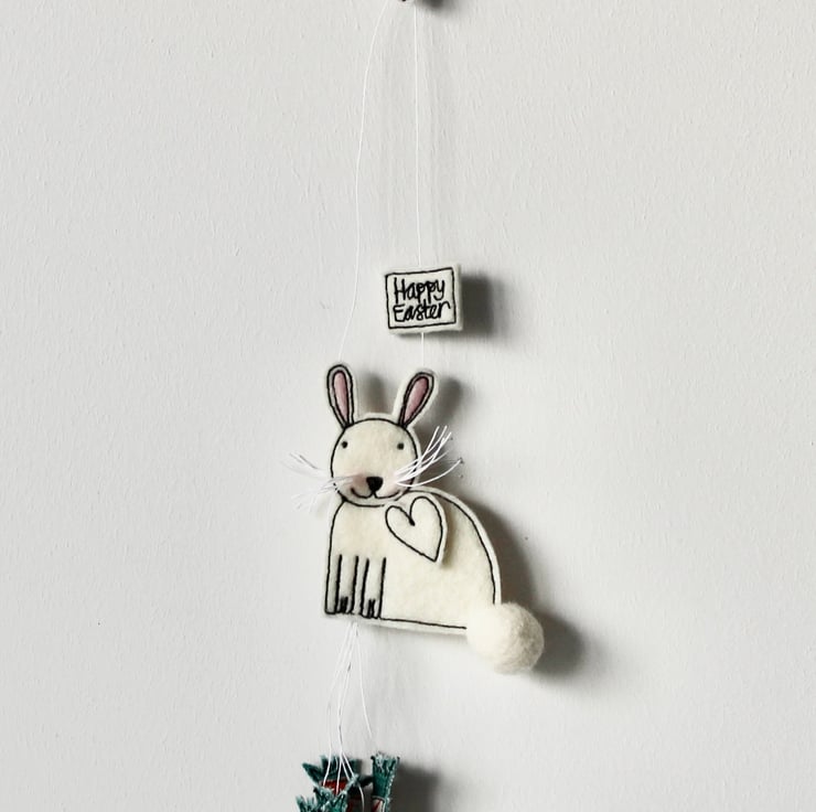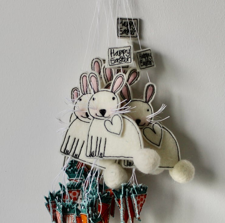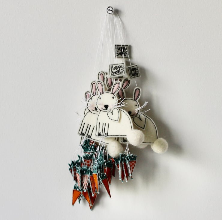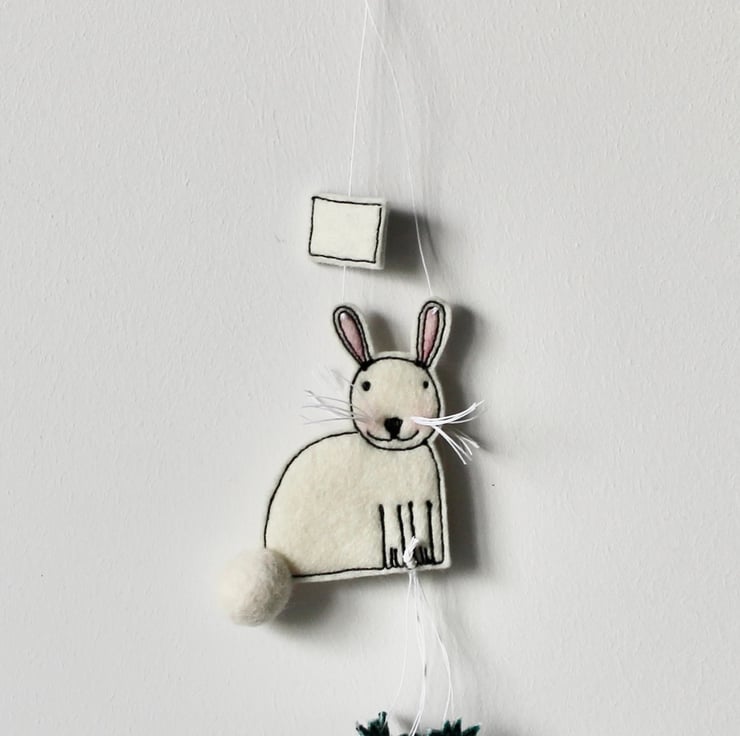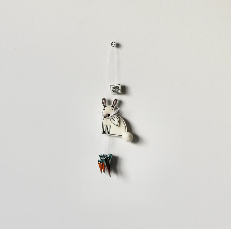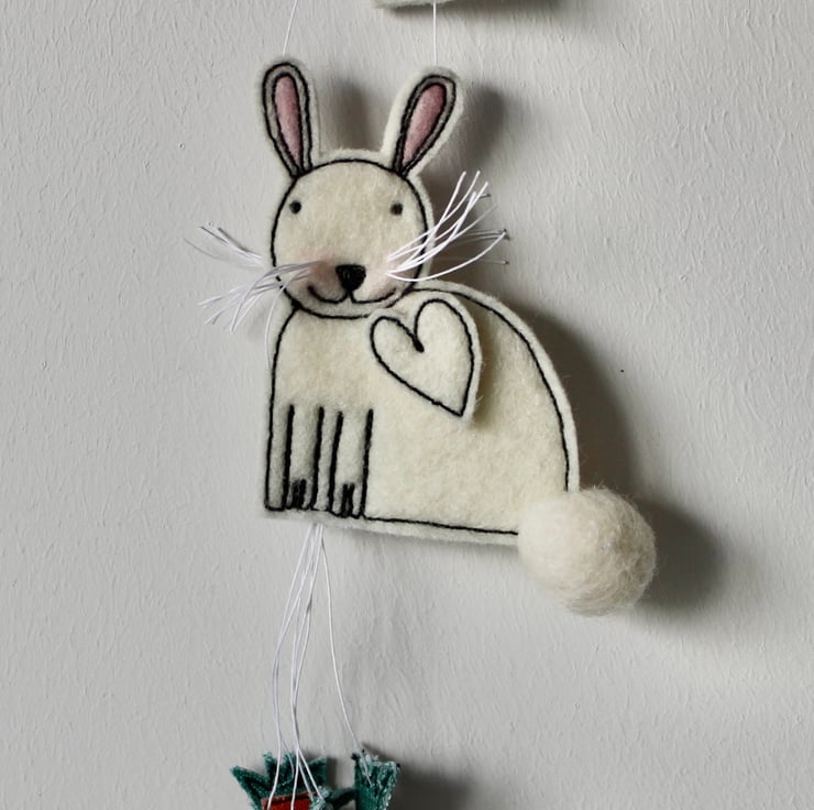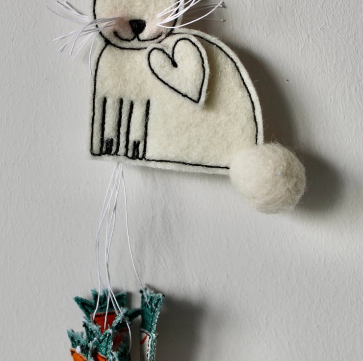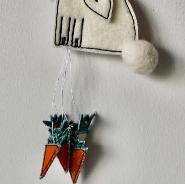 Bunny with carrots is created using freehand machine embroidery and multiple layers of cotton cloth and 100% wool felt. Cut out by hand using very sharp scissors with a linen thread to suspend. There is a wool felt ball for a little tail and linen thread whiskers.