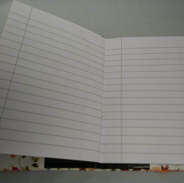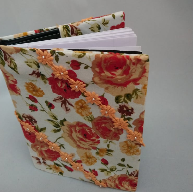 This is a lined notebook with a re usable fabric cover. The cover is made in 100% cotton , embellished with lace flowers and beads in the centre of each flower. There are approx 50 pages in the book. Measures 4.5" x 6.25"