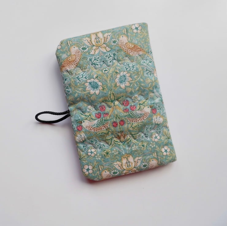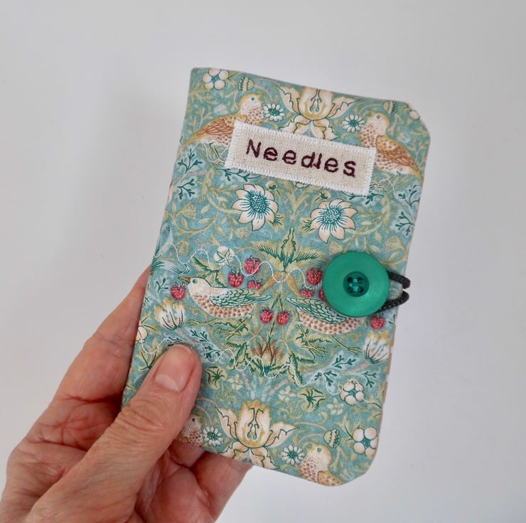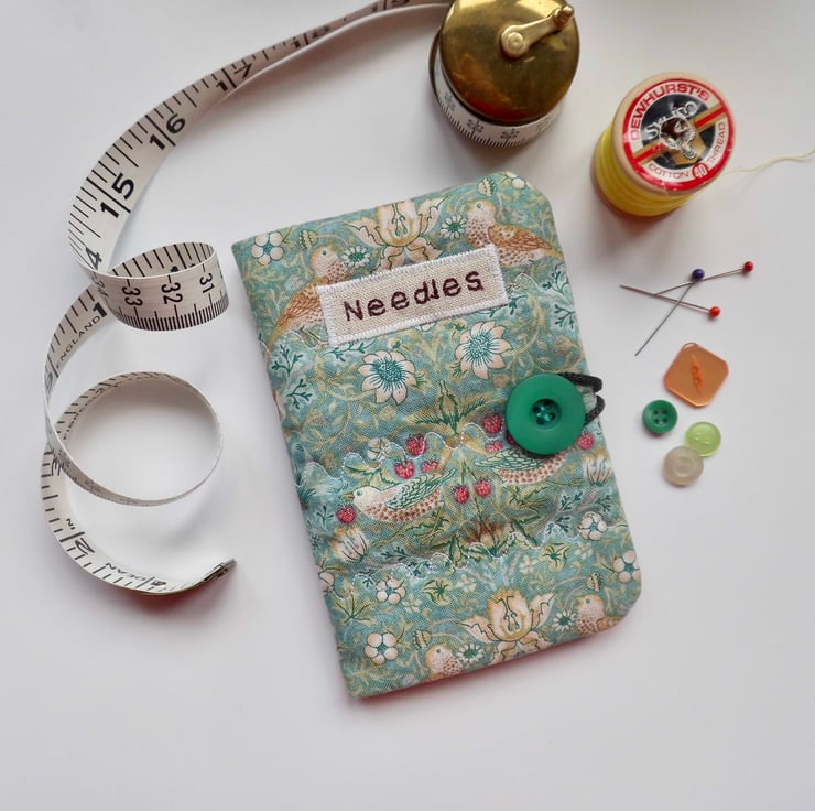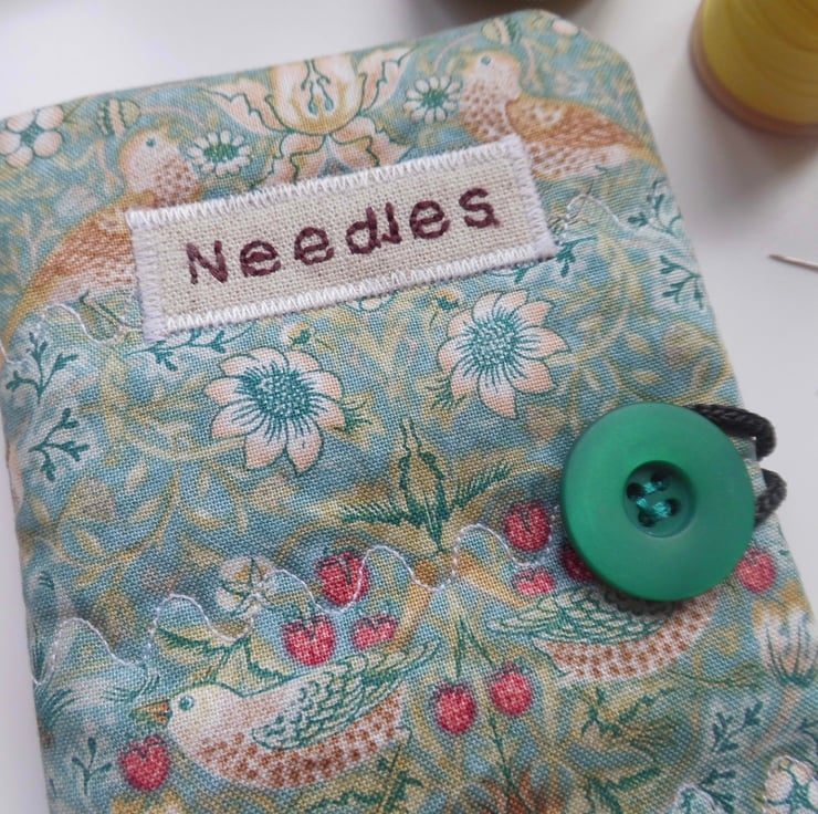 Use this little book to keep your needles neat and close at hand. I have made the cover using William Morris' iconic Strawberry Thief print in aqua colour way. I backed this fabric with iron-on fleece and then sewed three rows of wave stitch widthways in order to give a lightly quilted effect. I machine embroidered the word "Needles" in dark red thread onto a patch of linen and appliquéd this to the front.