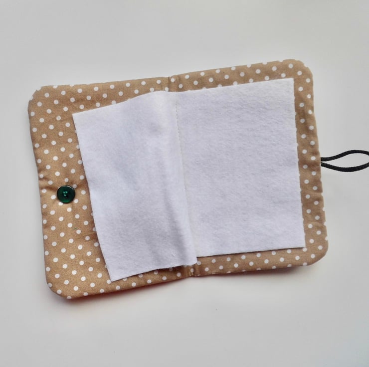 The lining is a coffee and white spotted quilting cotton.
