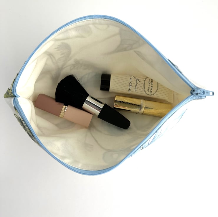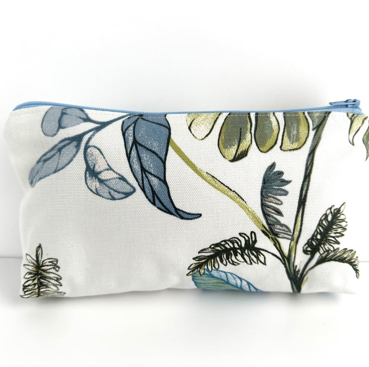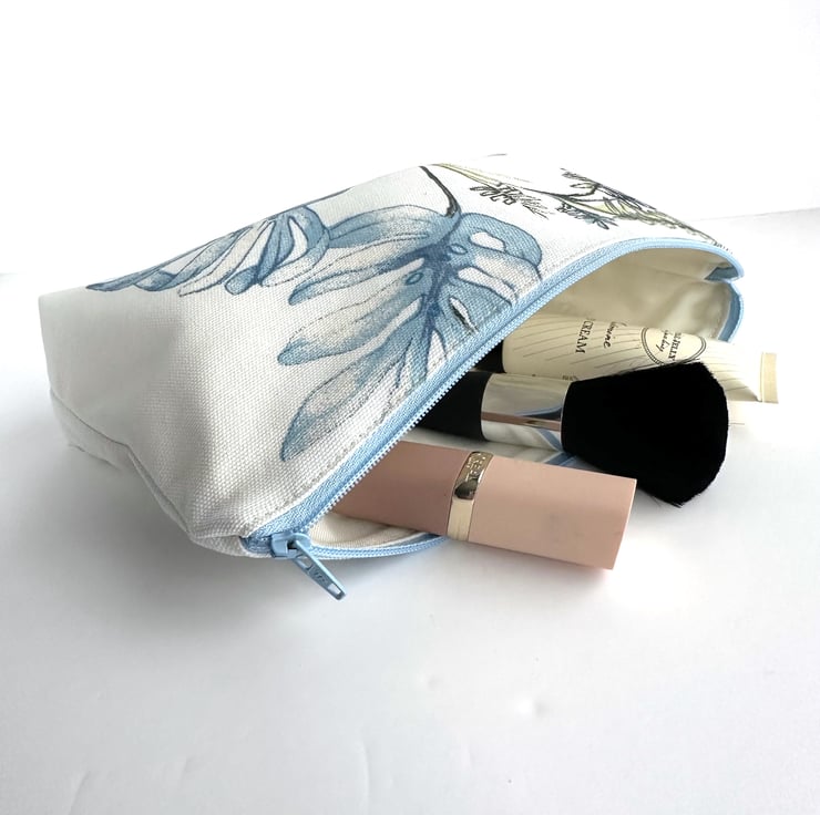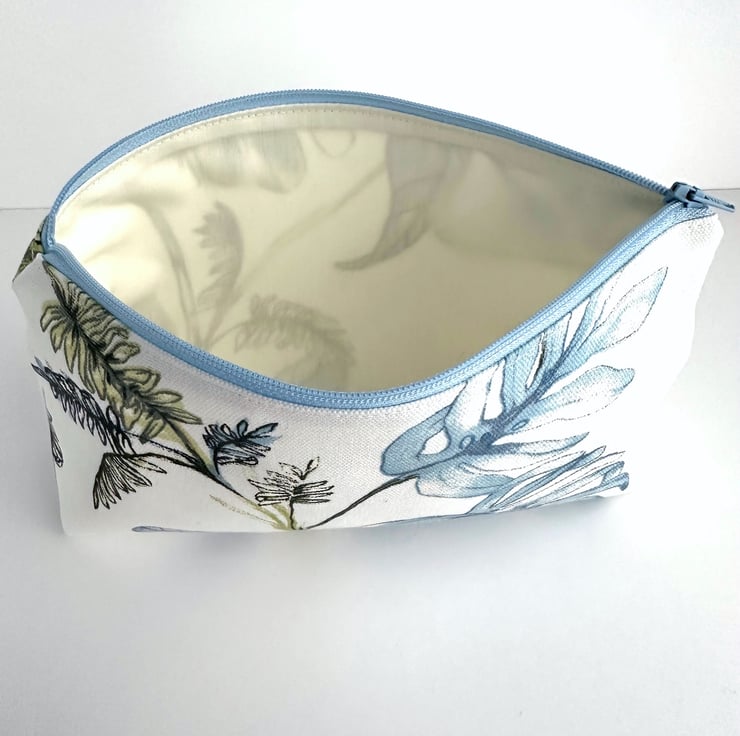Monstera make up bag. This useful cosmetic bag is made from lovely fabric with a delightful leafy print. The fabric is a pale ivory colour and has a pattern depicting two large monstera leaves in shades of pale to mid blue. There are sprays of other foliage in shades of blue and zesty green, with black detailing. The cosmetics bag fastens with a matching pale blue zip and is lined with cream fabric. The base of the bag is boxed giving lots of space inside.