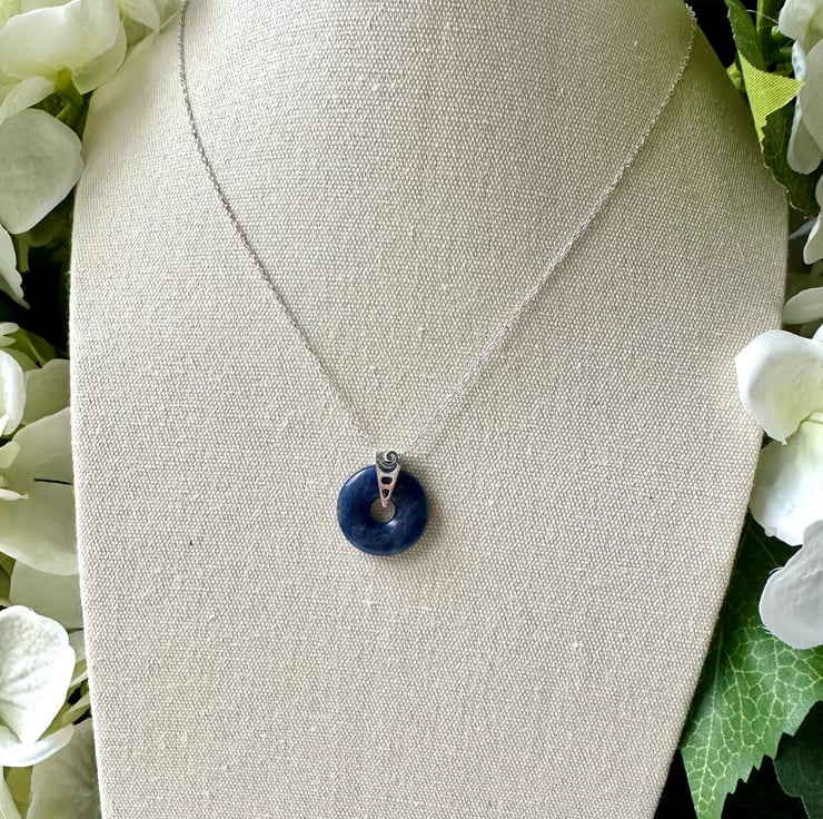Beautiful and simple, this stunning, small Sodalite donut pendant is suspended on a sterling silver bail and fitted with a sterling silver 18" chain.