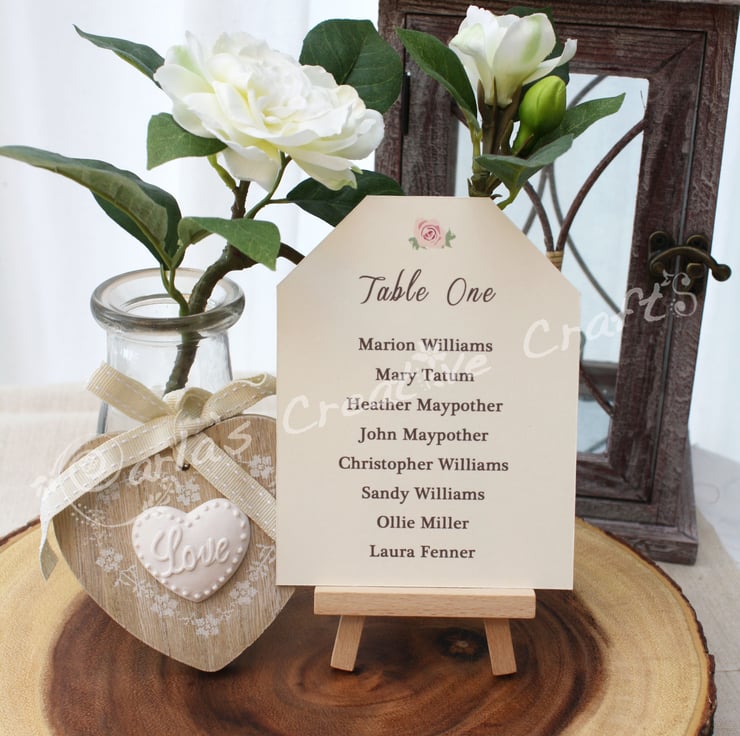 Personalised wedding table plan individual cards - Shabby chic rose themed, made just for you.