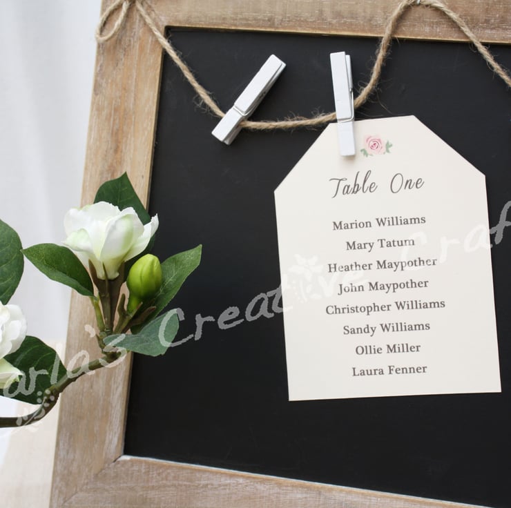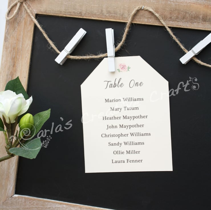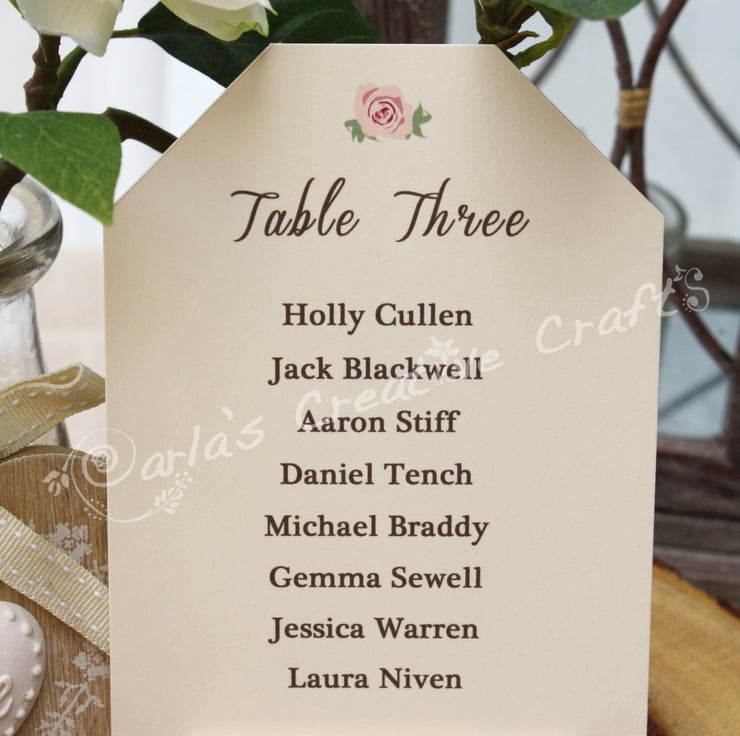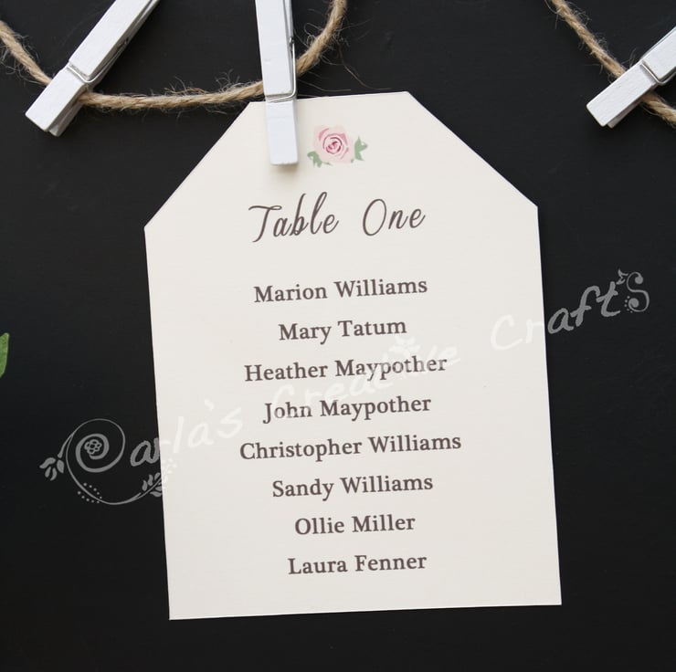 The table plan card includes my unique Shabby Chic rose design, these come personalised with your guests names printed on. These are great to use on a larger table plan at the entrance, hanging or on a table stand at the guests tables. They make great decoration's for any table at a wedding, birthday, celebration or tea party.