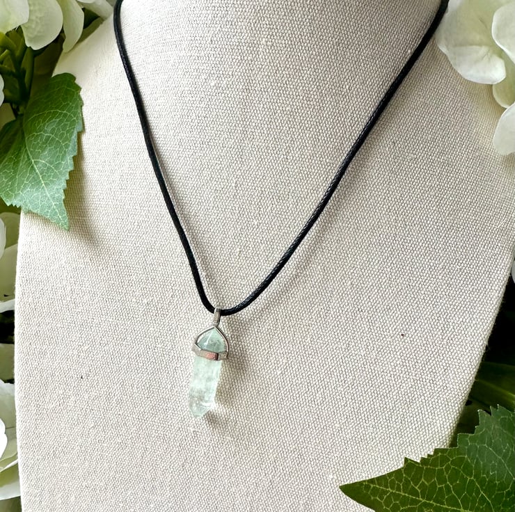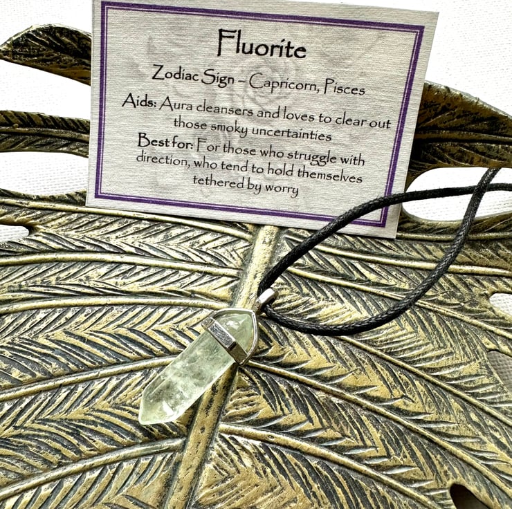 The Fluorite pendant measures 8mm in diameter and is just over 3cm long and comes complete with a printed card, which gives the properties associated with the Fluorite crystal. The card also gives the associated zodiac sign, which is unrelated to the specific properties of the stone.