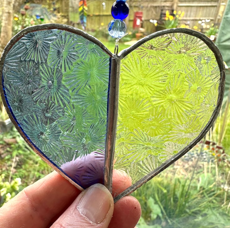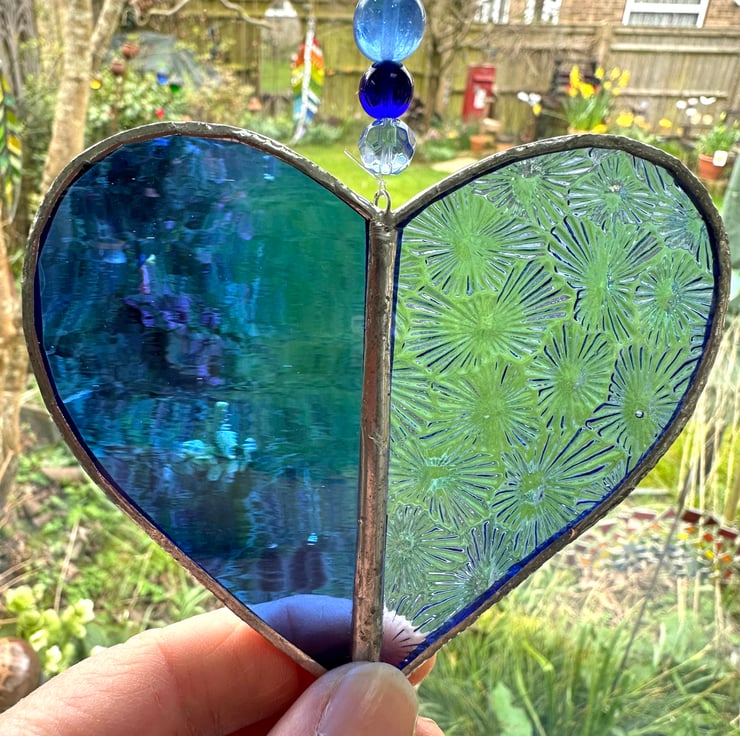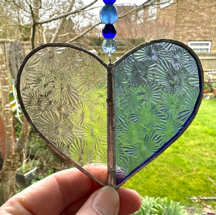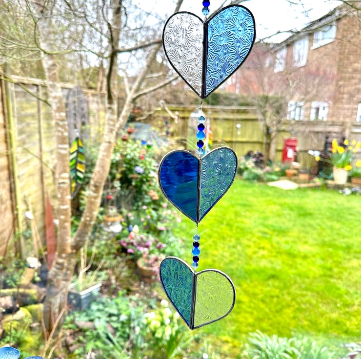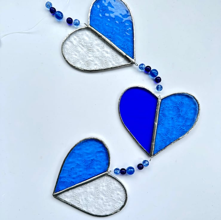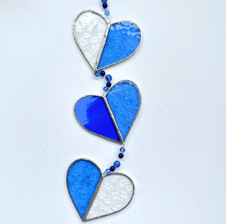 This suncatcher is made from a string of 3 blue and clear stained glass hearts strung together with beaded fishing line.