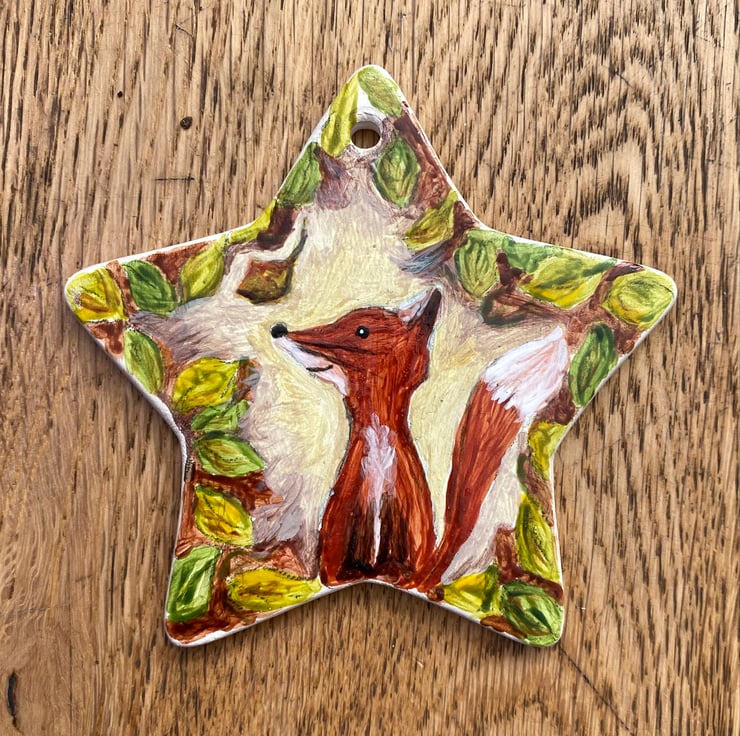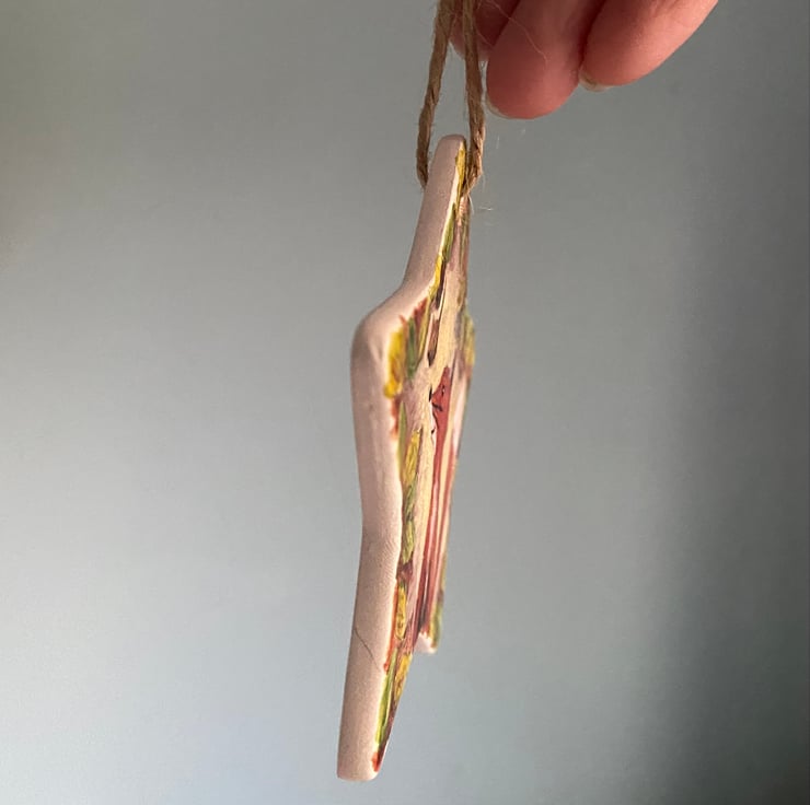 Hand painted ceramic star shaped hanging decoration.
