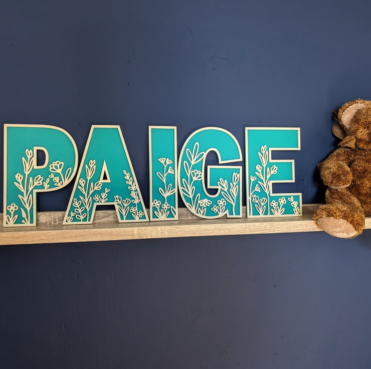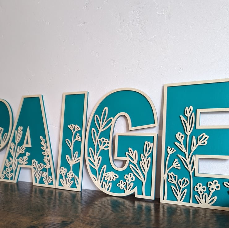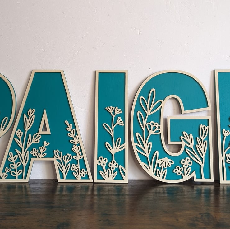 These wild flower-themed letters are laser-cut from MDF and hand-painted in the colour of your choice. Each letter has a different theme but please note that the letters may have the same or similar designs.