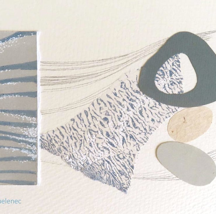 An original collage and mixed media artwork of pebbles on the shore depicting the slow erosion of wind and water on the coast. This piece shows a hag stone or holey stone amongst the pebbles, the light glinting off the sea and wind creating ripples on the tide in tones of cream, green and soft grey blue.
