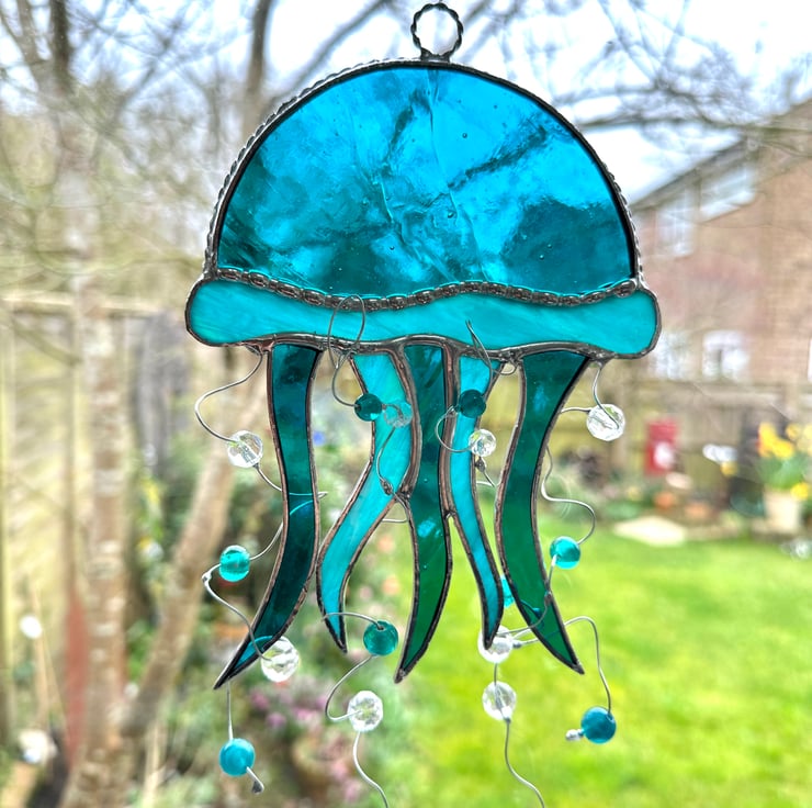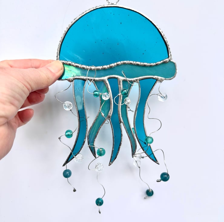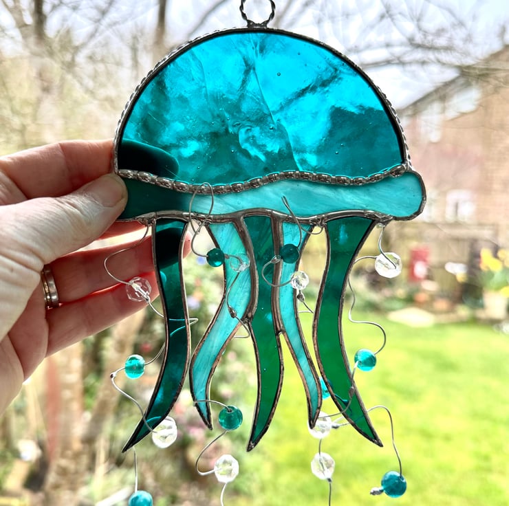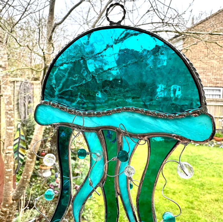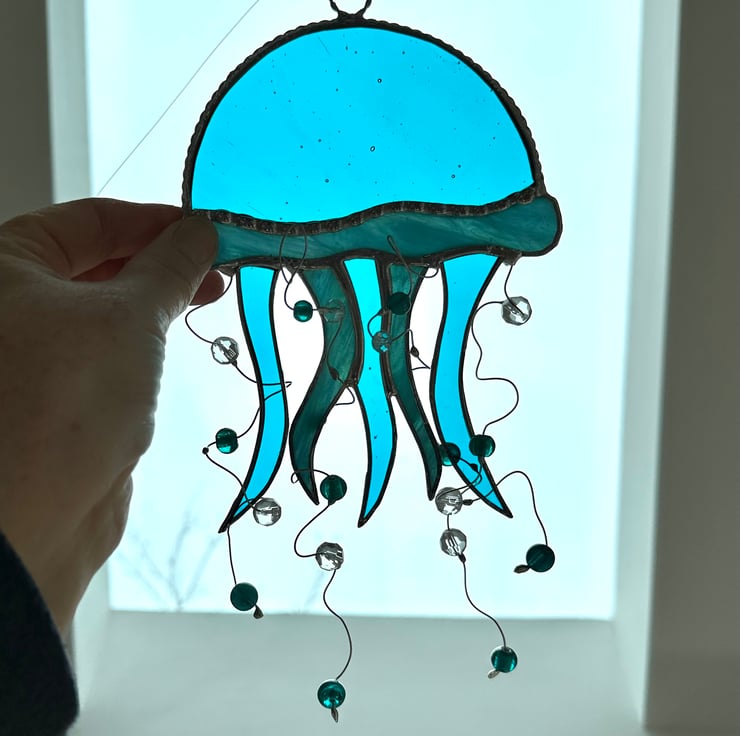 Each piece of glass has been cut by hand so every jelly fish will be slightly different.
