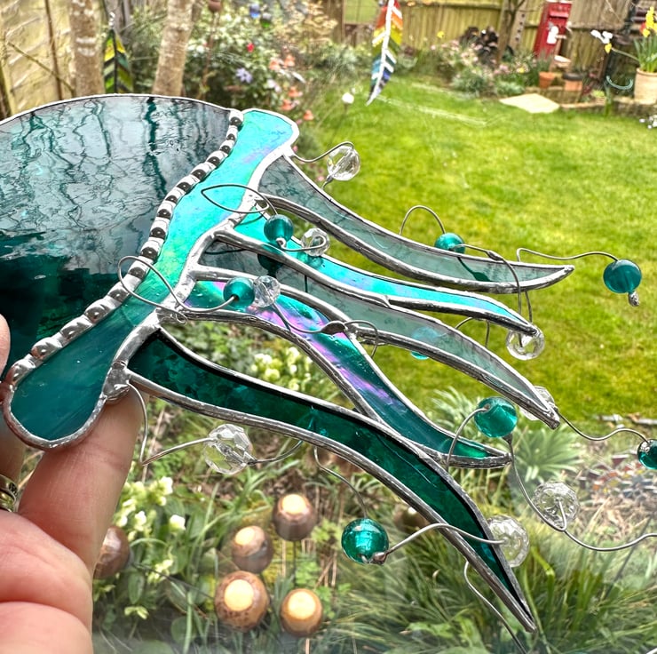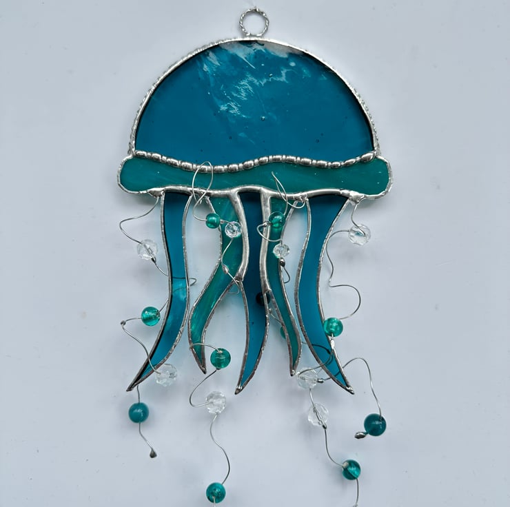 The glass used for this jellyfish is teal sea glass and a iridised streaky turquoise sea glass. I have added 4 lengths of tinned copper wire with turquoise round beads and faceted clear beads for the tentacles.