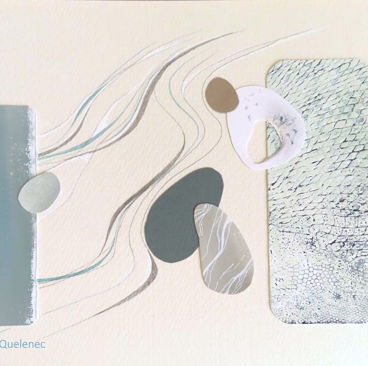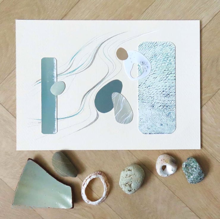This is one of a series of works made from a selection of papers hand coloured and selected for their patterns and textures in shades of sage, mint and cream.