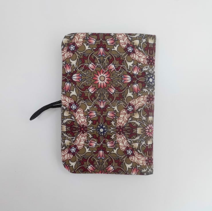 Use this little book to keep your needles neat and close at hand. I have made the cover using a beautiful William Morris print of stylised leaves and blooms in shades of red on a brown background. I backed this fabric with iron-on fleece and then sewed three rows of wave stitch widthways in order to give a lightly quilted effect. I machine embroidered the word "Needles" in dark red thread onto a patch of linen and appliquéd this to the front.