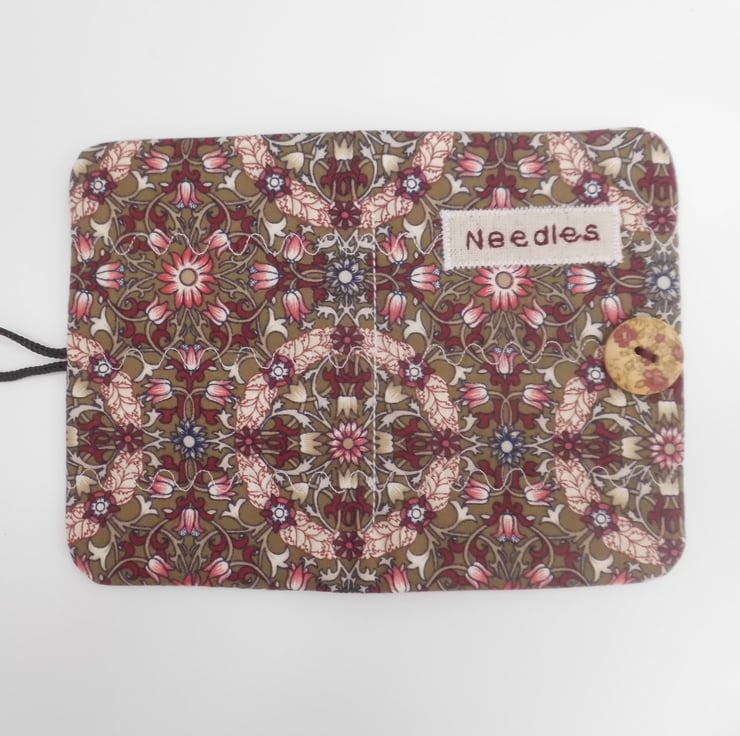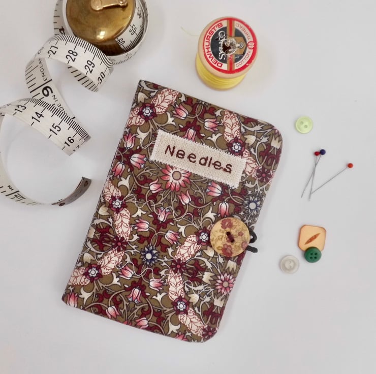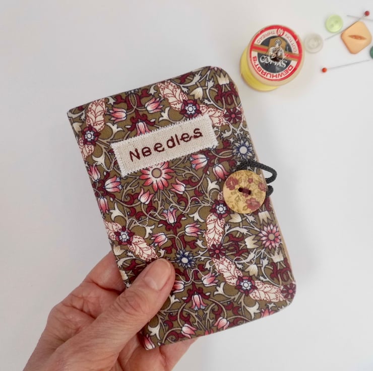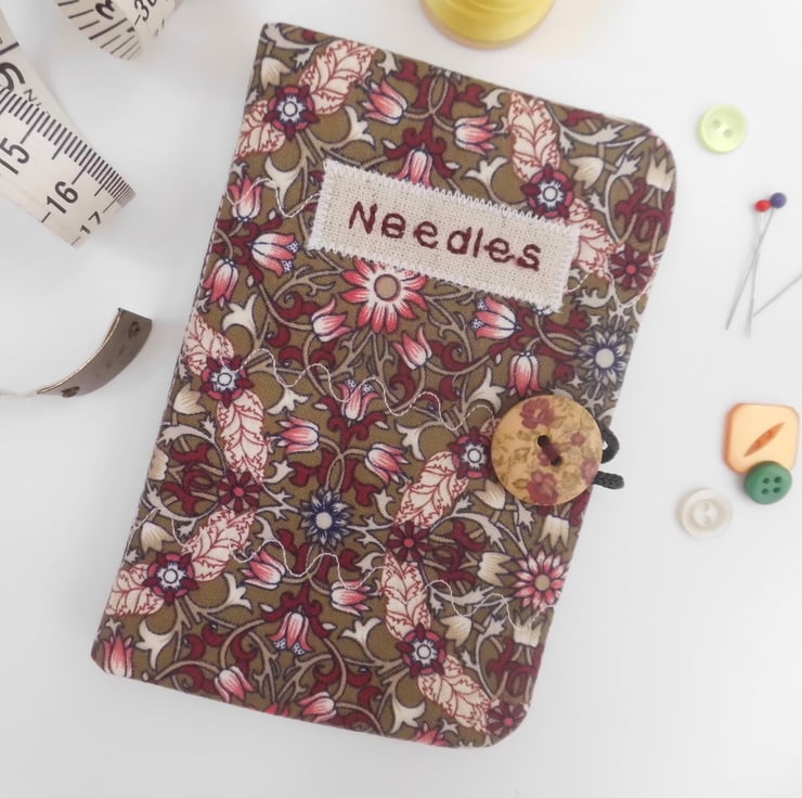 Use this little book to keep your needles neat and close at hand. I have made the cover using a beautiful William Morris print of stylised leaves and blooms in shades of red on a brown background. I backed this fabric with iron-on fleece and then sewed three rows of wave stitch widthways in order to give a lightly quilted effect. I machine embroidered the word "Needles" in dark red thread onto a patch of linen and appliquéd this to the front.