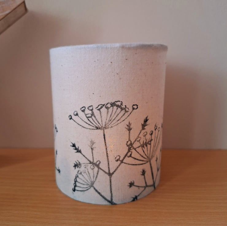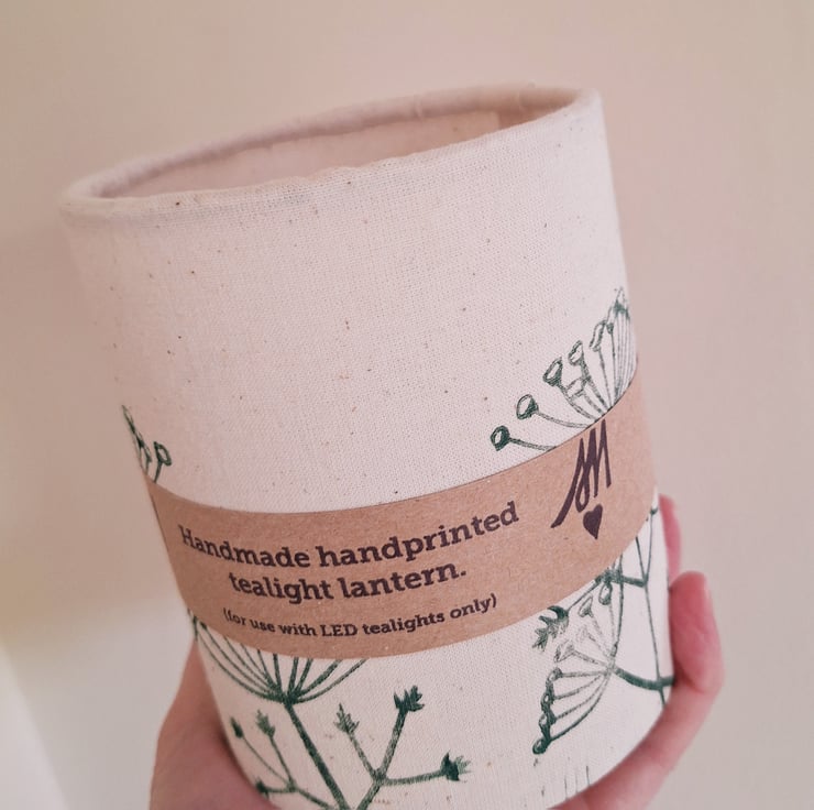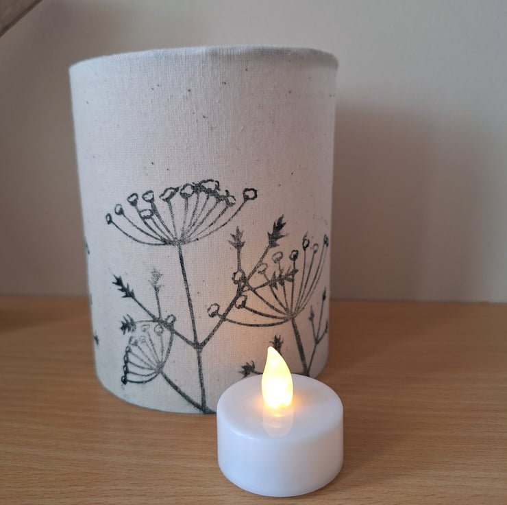 This botanical handmade LED tealight lantern has a linoprinted cow parsley design printed in very dark green/black fabric ink around the off-white 100% cotton fabric. It is supplied with a soft white flickering LED tealight which gives a cosy soft glow. The design is based on some of my favourite wild plants found in the nearby fields and hedgerows and has been designed and linoprinted onto the fabric by myself.