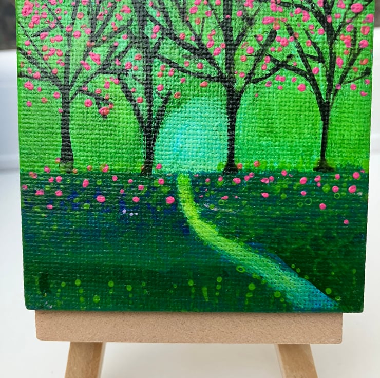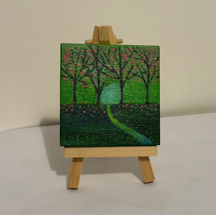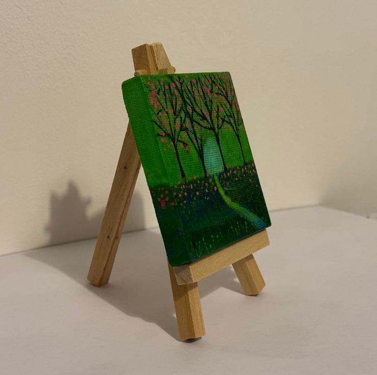 Mini forest acrylic painting. With free mini easel. Has been varnished.