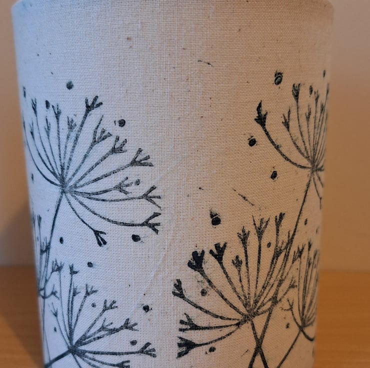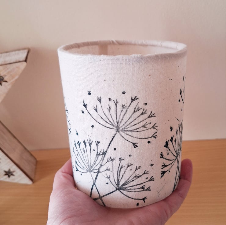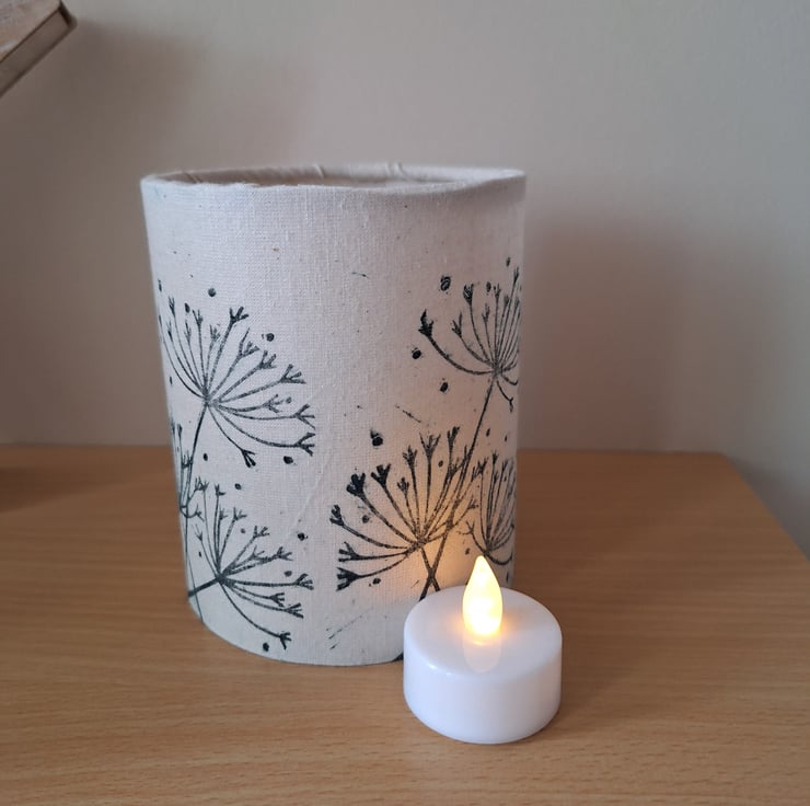 This botanical handmade LED tealight lantern has a linoprinted cow parsley design printed in very dark green/black fabric ink around the off-white 100% cotton fabric. It is supplied with a soft white flickering LED tealight which gives a cosy soft glow. The design is based on some of my favourite wild plants found in the nearby fields and hedgerows and has been designed and linoprinted onto the fabric by myself.