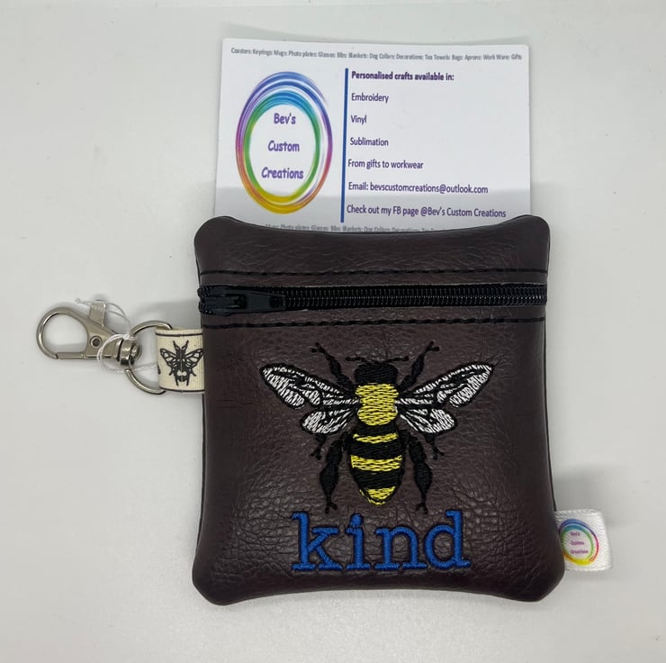 Embroidered Bee with the word Kind underneath simple mini bag/purse use for loose change.