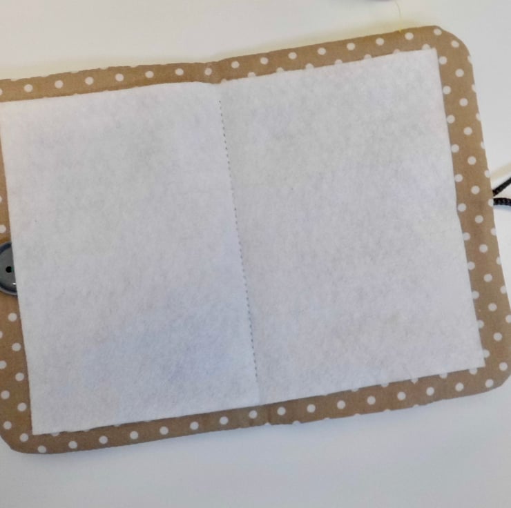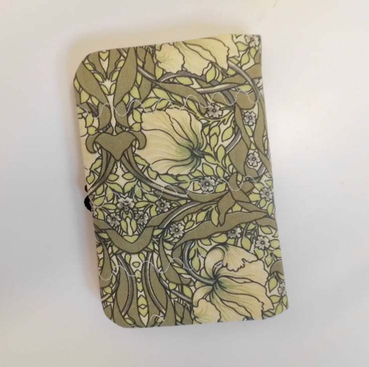 Use this little book to keep your needles neat and close at hand. I have made the cover using a beautiful William Morris print which has green leaves swirling around cream poppies and tiny pimpernel flowers. I backed this fabric with iron-on fleece and then sewed three rows of wave stitch widthways in order to give a lightly quilted effect. I machine embroidered the word "Needles" in dark red/brown thread onto a patch of linen and appliquéd this to the front.