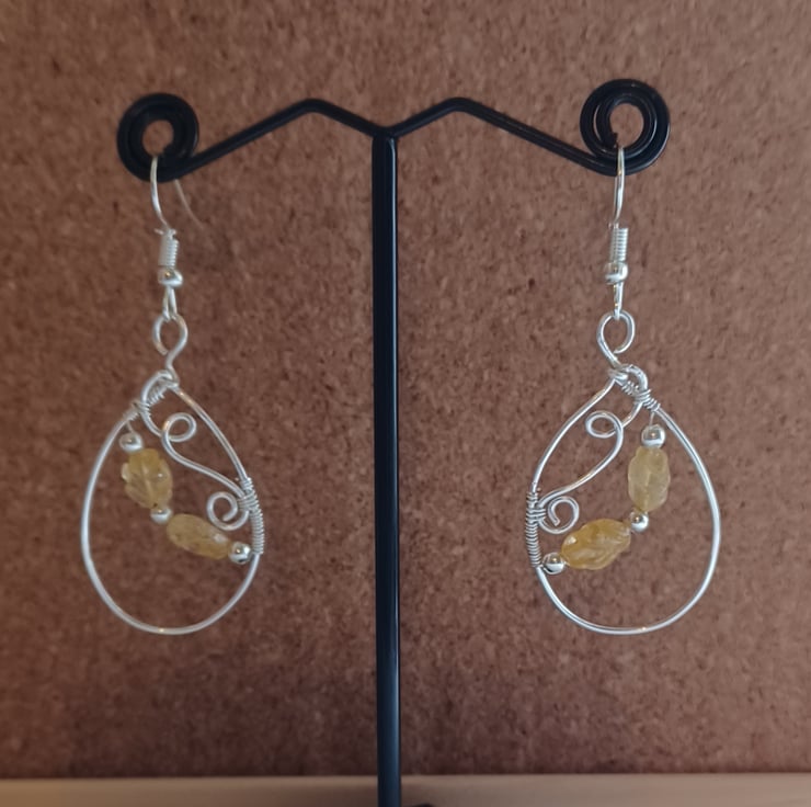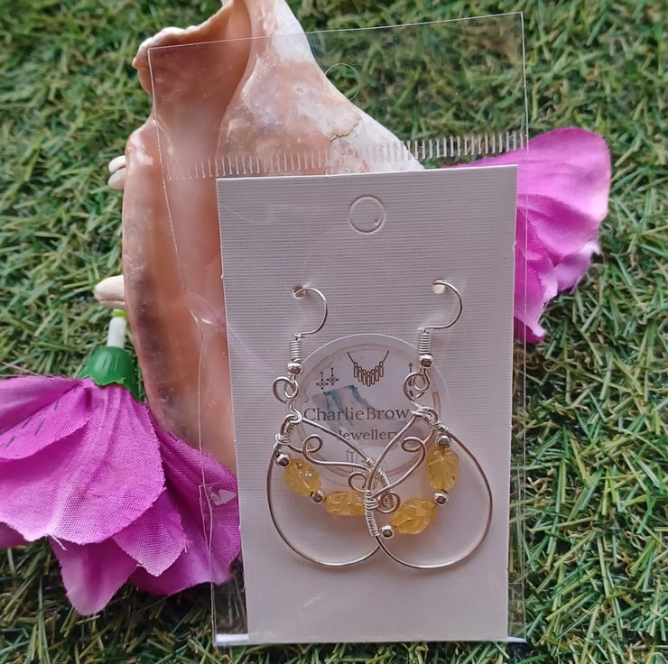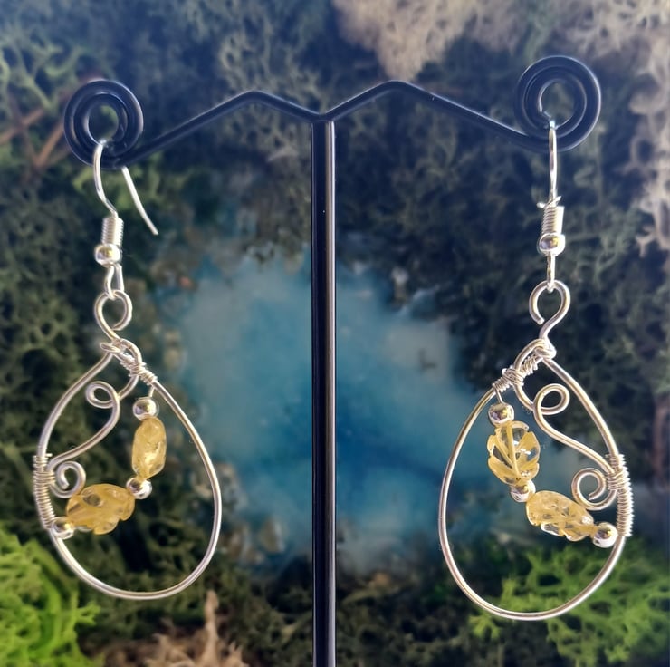 These beautully unique earrings have been handcrafted using silver plated copper wire. An oval shape with ornate swirls featuring carved citrine beads and silver plated spacers. The earhooks are silver plated and the earrings hang at approximately 6cm in length.