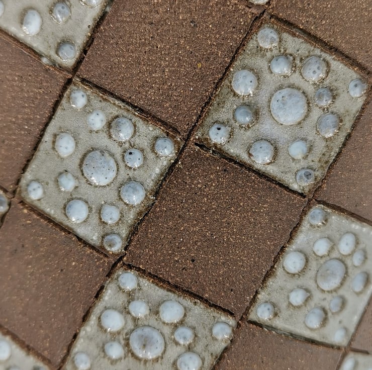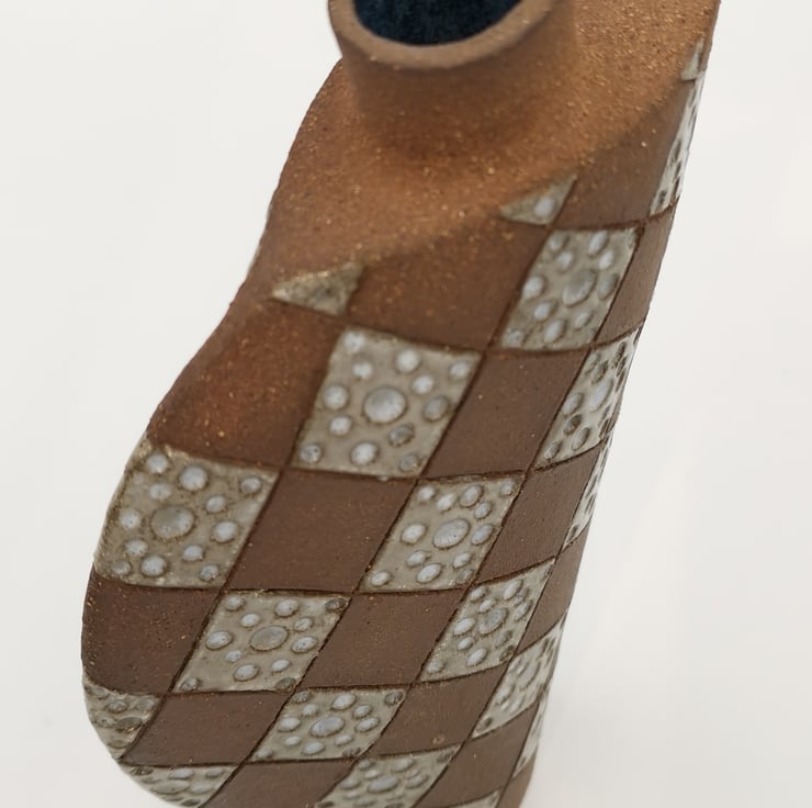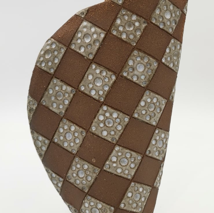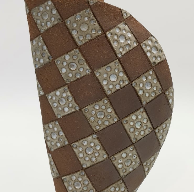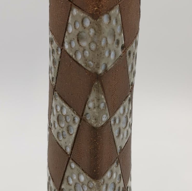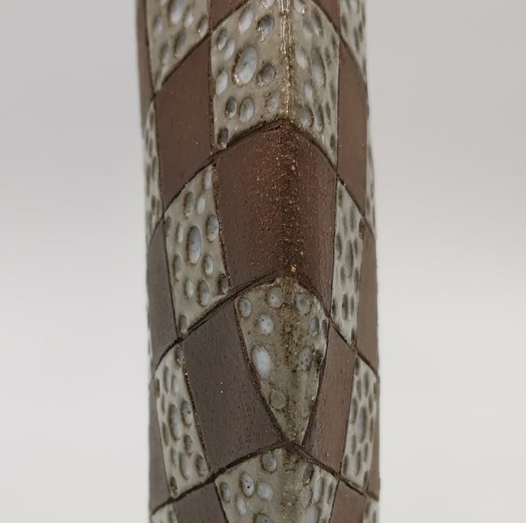 This vase is slab built using grogged stoneware clay with a hand impressed chequered design finished with a white glaze.