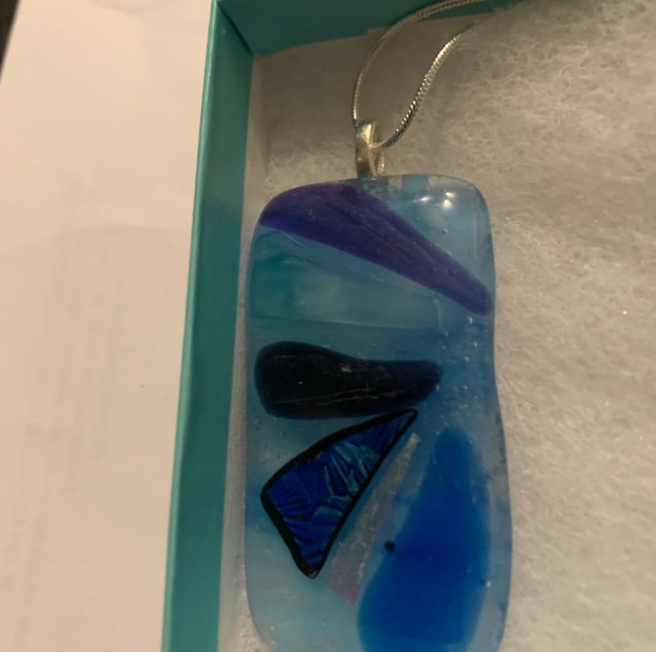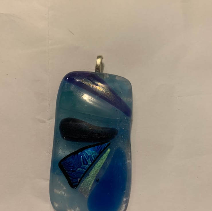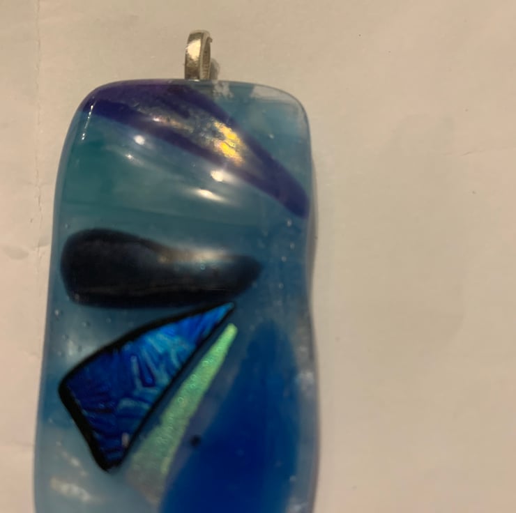 It has 5 long triangles of different shades of blue. Navy blue-iridescent glass, Navy opal glass, Royal blue- Dichroic glass and Royal blue opal and Duck egg blue Dichroic glass. It comes with a Silver bail and Silver snake chain- 18 inches long. The pendant measures 2.5 inches long and 1 inch wide.