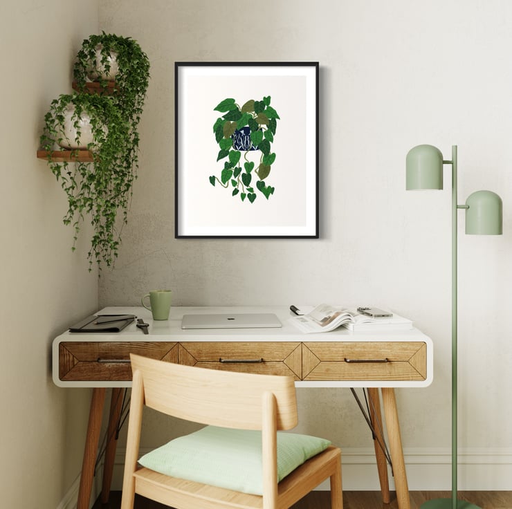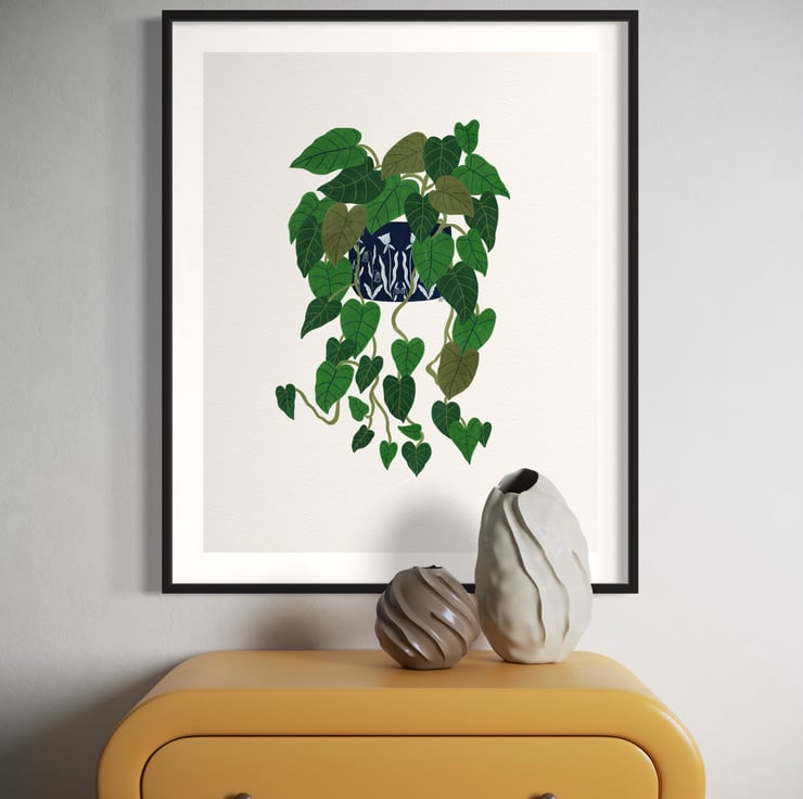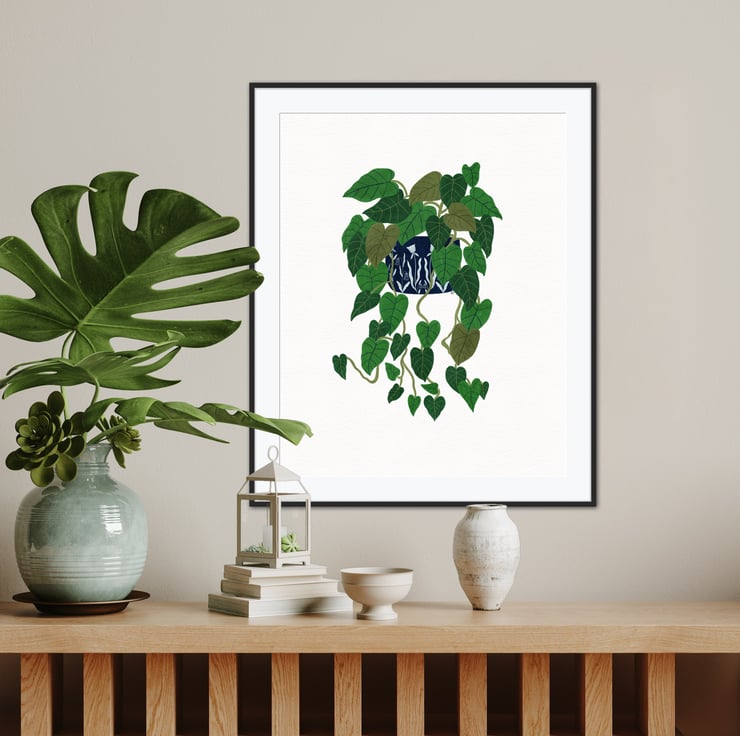 A beautiful art print of my original illustration of a Heart Leaf Philodendron indoor plant, with beautiful details on pot that makes it look like it’s a porcelain pot.