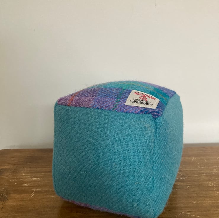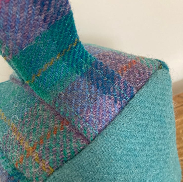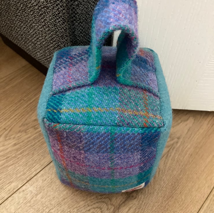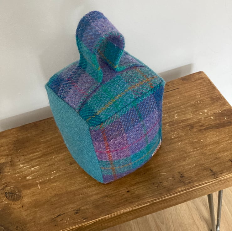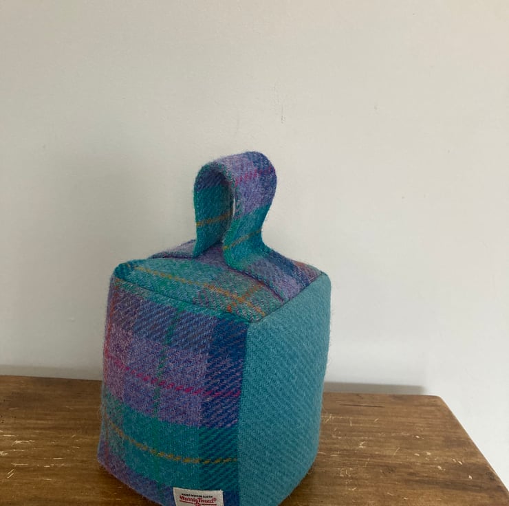 This doorstop has been made using a combination of Kingfisher Blue and Violet Check a long side a Plain Turquoise Harris Tweed.