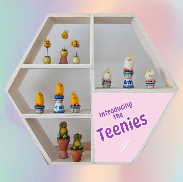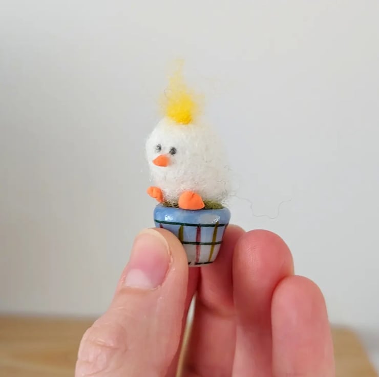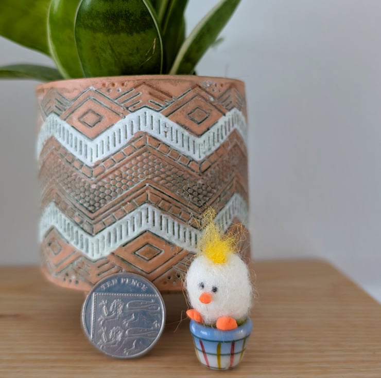 Cute little chick, handmade with the needle felting technique. Just about the size of a 10p, this teeny creation is sure to look cute amongst your Easter decor. Made out of wool and sat atop a ceramic plant pot, he's ready to be popped on a shelf or wherever you fancy having him! He's perfect for collecting, check out my other miniatures!