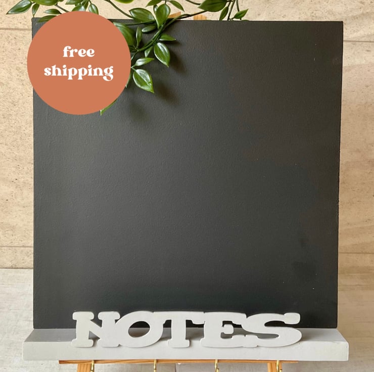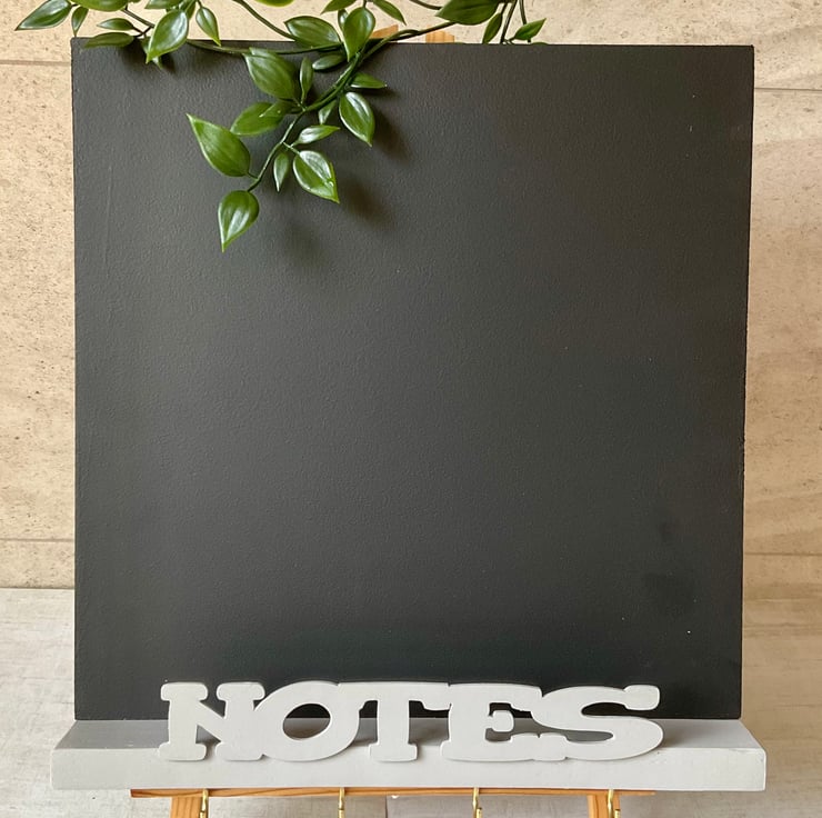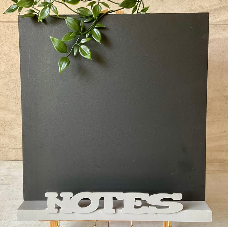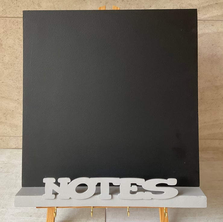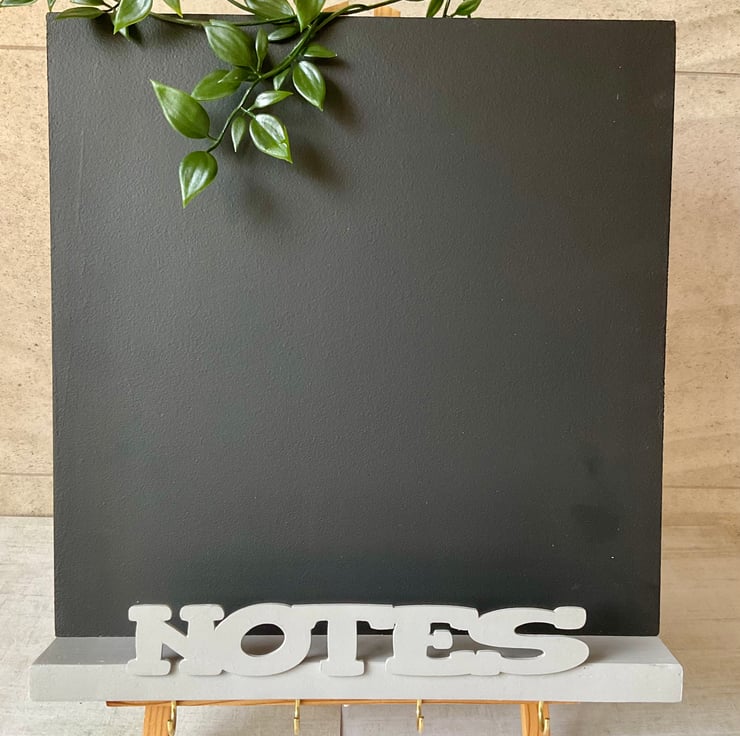 The blackboard has been crafted from upcycled MDF which has been painted with blackboard paint. A grey shelf, perfect for the chalk, made from upcycled battens, with the laser cut word Notes has been added.