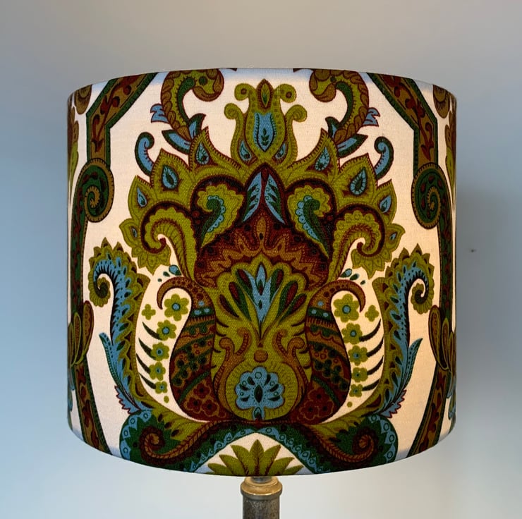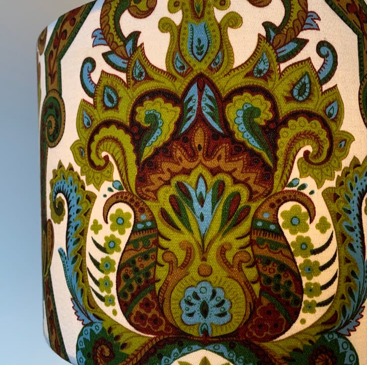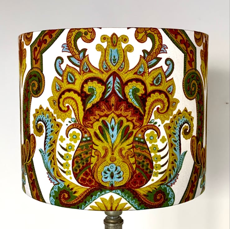 Ornate Colourful Boho 60s 70s Yellow Blue Mustard Langdale VIntage fabric Lampshade , fabric in good vintage condition with strong, bright colours! This fabric design is call ‘ Langdale ‘ from Tootal