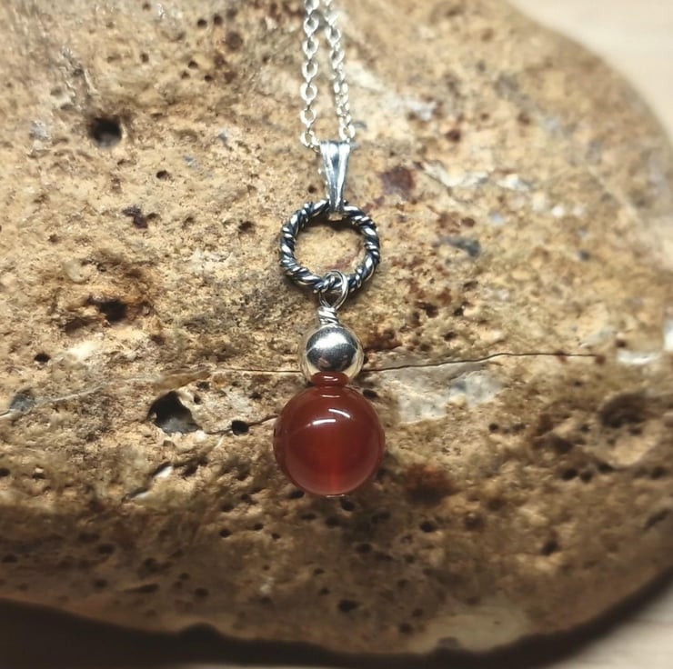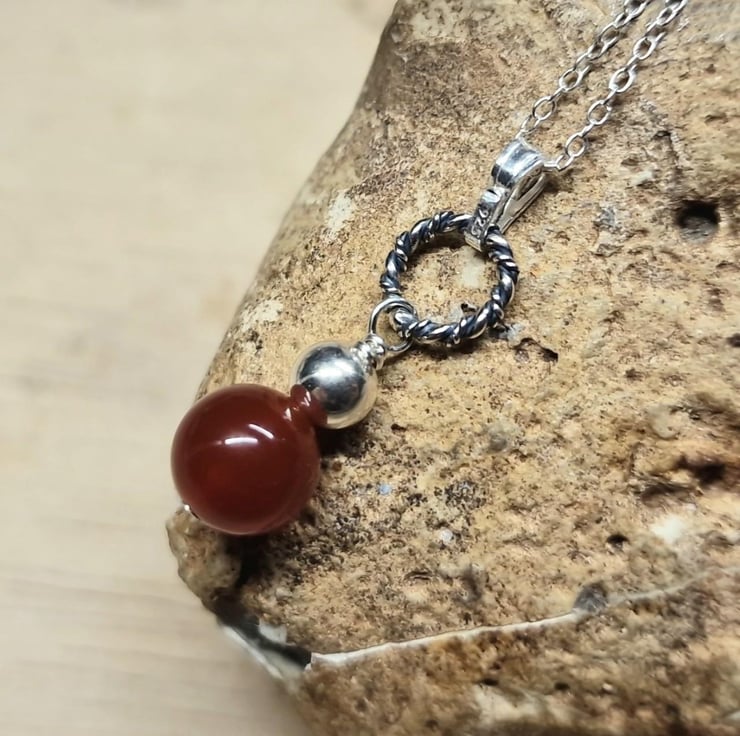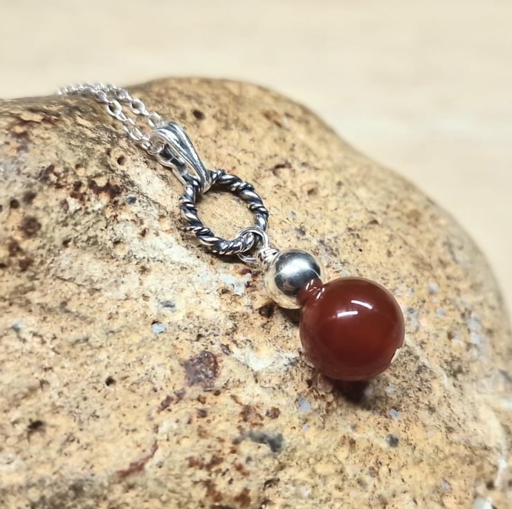 This is a women's sterling silver red Carnelian pendant with rope circle detailing wire wrapped with sterling silver wire.