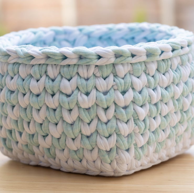 Small storage baskets, handmade, crocheted baskets perfect for organising and storing a wide range of items. Made from recycled tshirt cotton with no chemical dyes, this product is environmentally friendly.