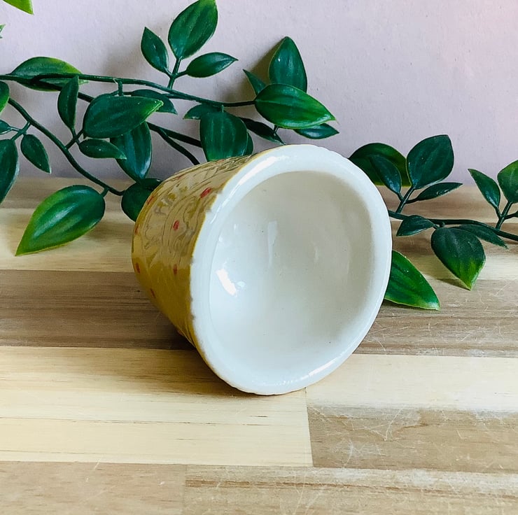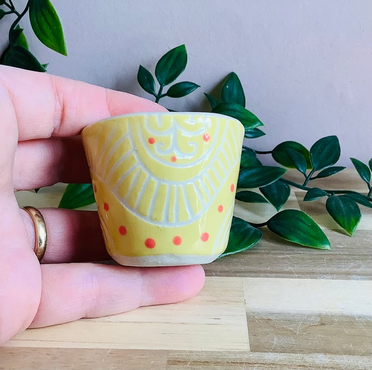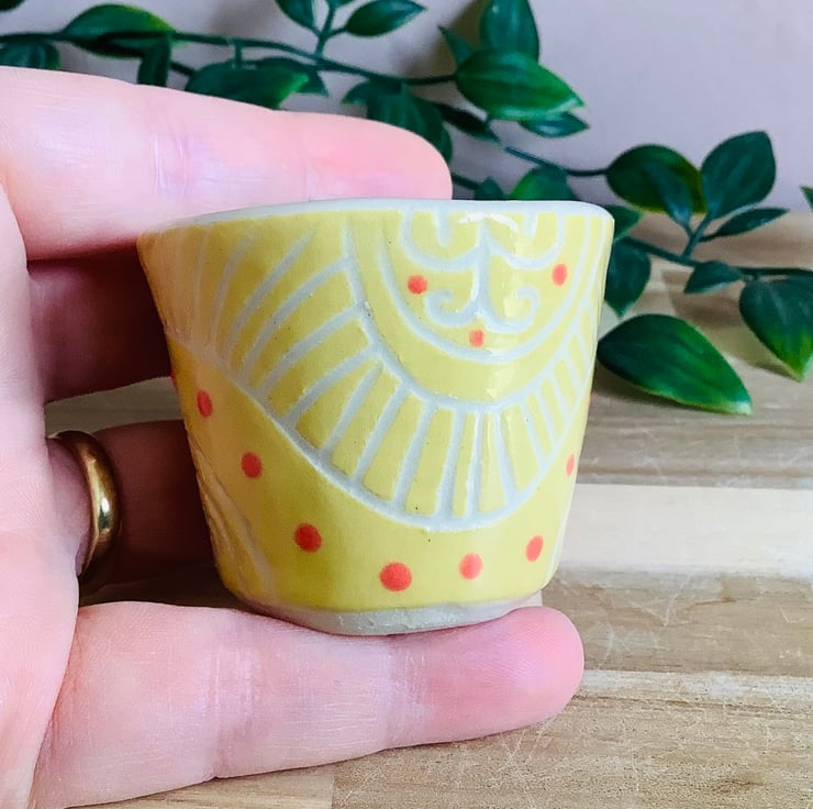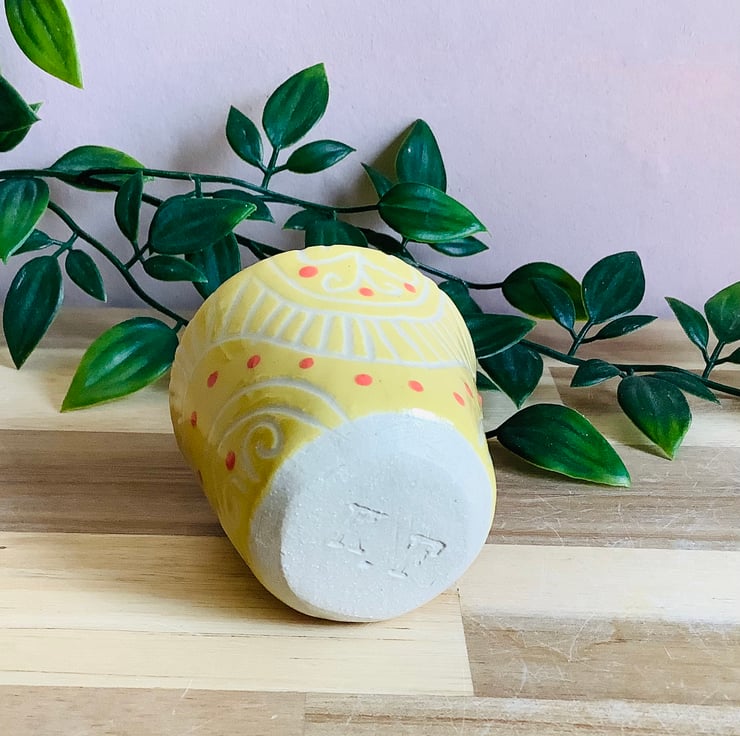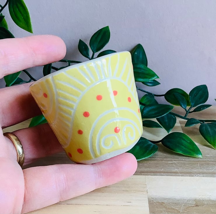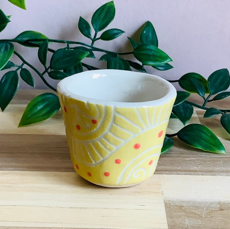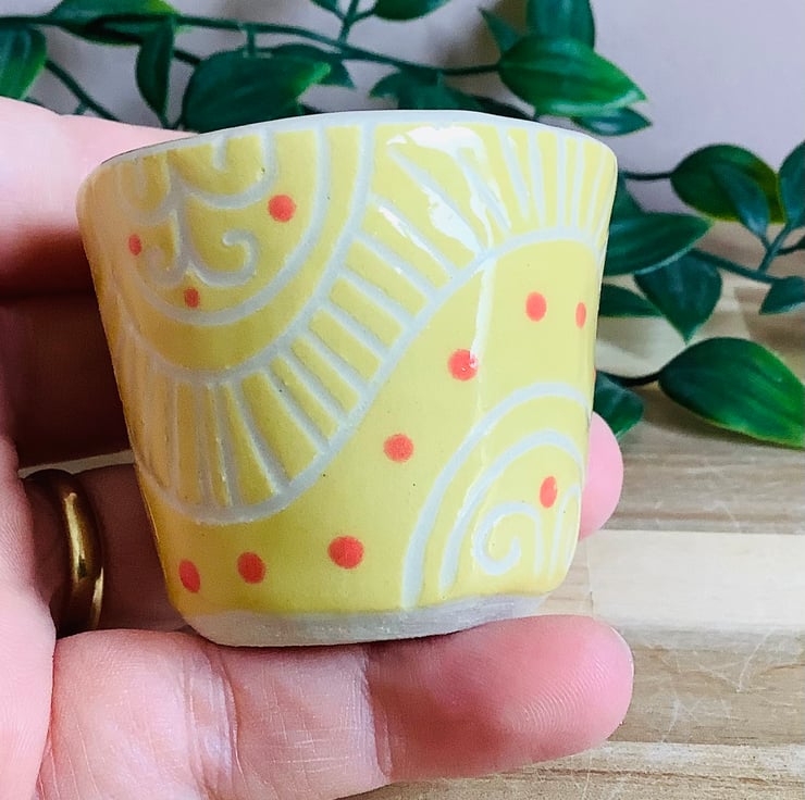 This lovely handmade stoneware sgraffito egg cup is glazed in vibrant buttery yellow and has a wave pattern carved on to its surface.