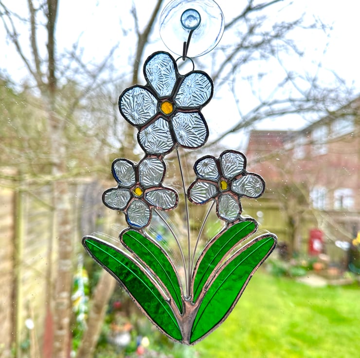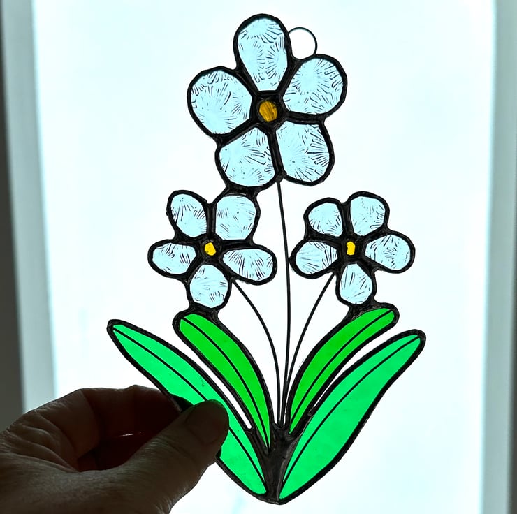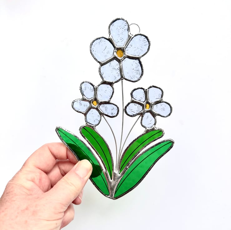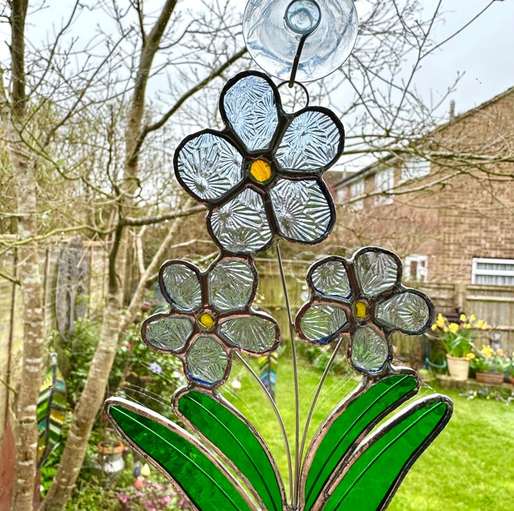 Foget me not stained glass flower made by Carole's Glass.