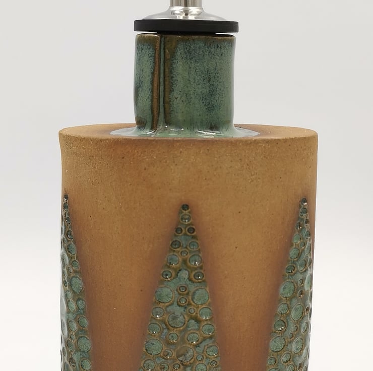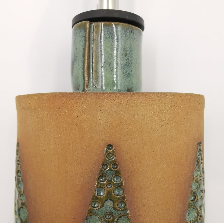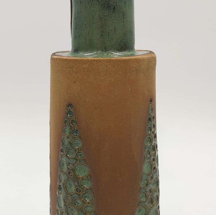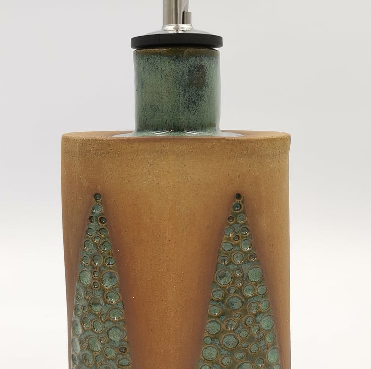 This oil drizzler is slab built using stoneware clay in a flask style shape with a hand impressed triangle design and part glazed in a kiwi green glaze.