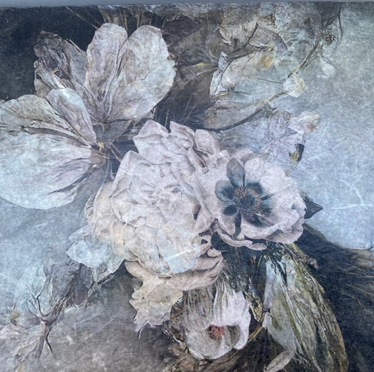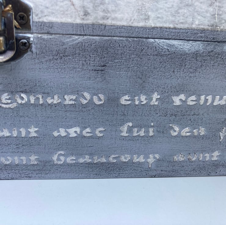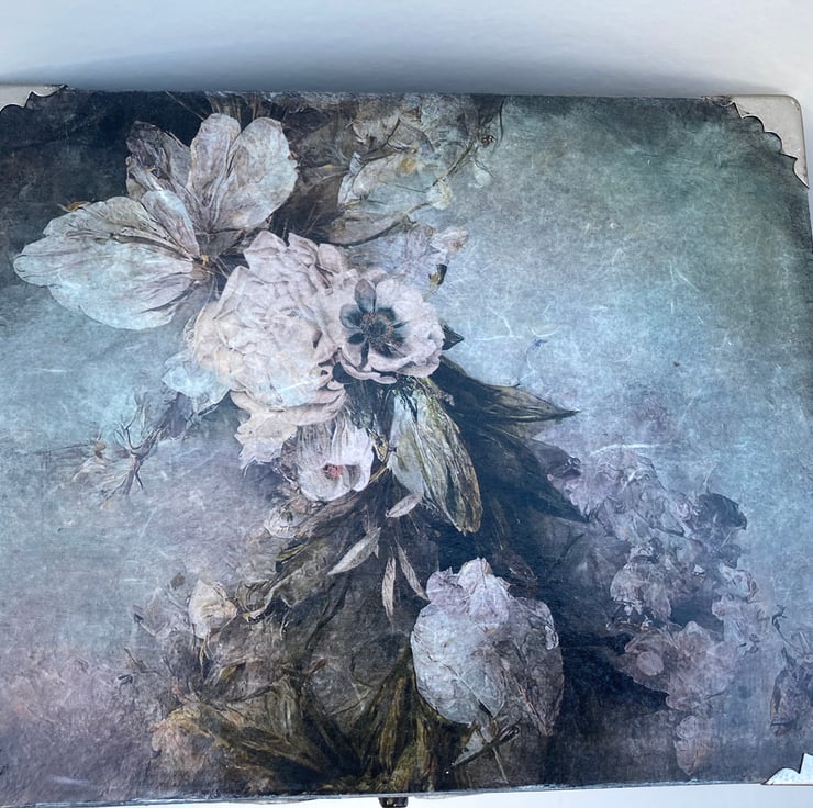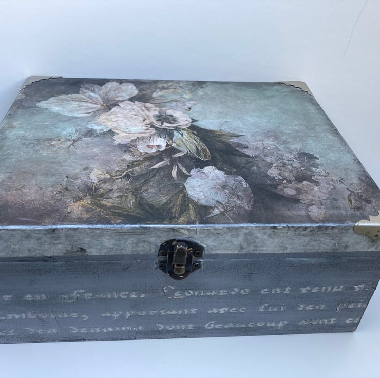 This beautiful large box has been decoupaged with a stunning vintage roses rice paper on the lid. The rest of the box has been painted and aged with various techniques then a raised french script has been applied around the sides with an artist modelling paste.