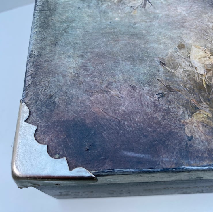 The box is painted in a lovely french grey and then varnished to protect it. Finally it has been fitted with 4 silver tone metal corners which give an aesthetic appeal plus it protects the edges of the box from damage. The box is also painted inside with french grey. I have added touches of silver which enhances the grey