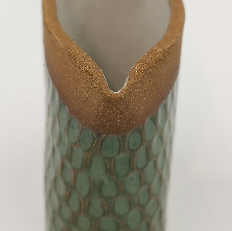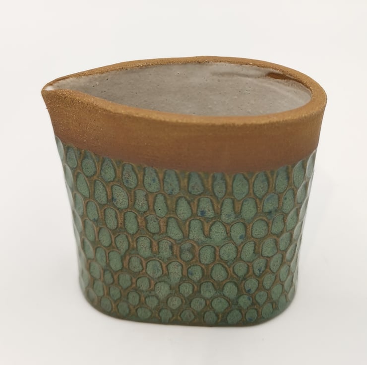 Ceramic milk pourer. This pourer is slab built in stoneware clay. It has a hand carved 'fish scale' surface texture and part glazed in a kiwi green glaze and white glazed interior.