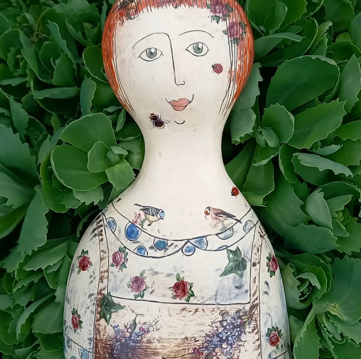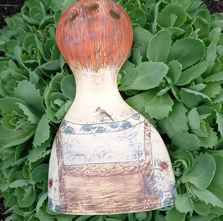 Handmade in white clay and painted with coloured slips and glazed in a transparent glaze. Ceramic decals of flowers and insects are fired on to add detail. Openings at the back allow for dried flowers and grasses. Measures approximately 23cms in height. Will be carefully packed and posted.